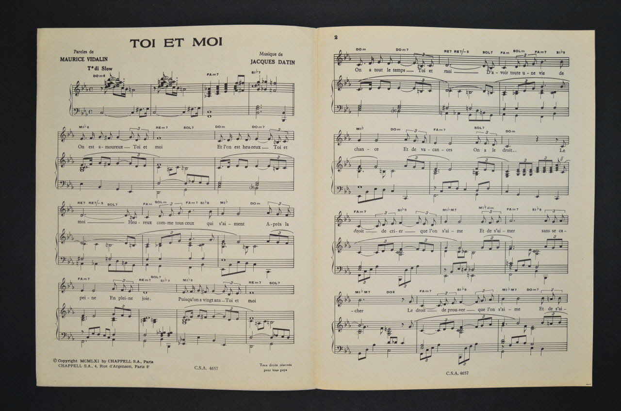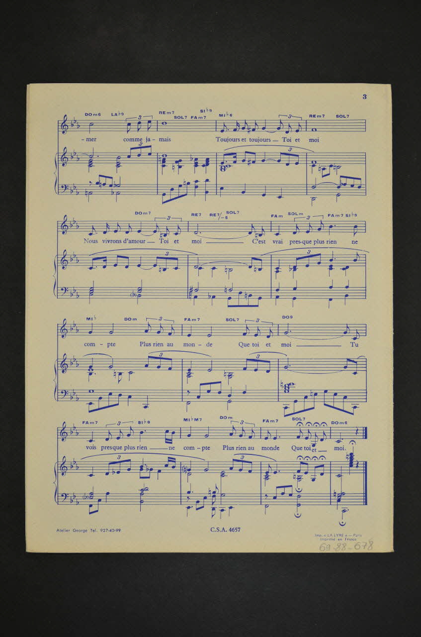 Les inscriptions renseignent le titre de la chanson, le nom des auteurs, de l'artiste et de l'éditeur. A l'intérieur et au dos, la partition et les paroles de la chanson.Matériaux et techniques