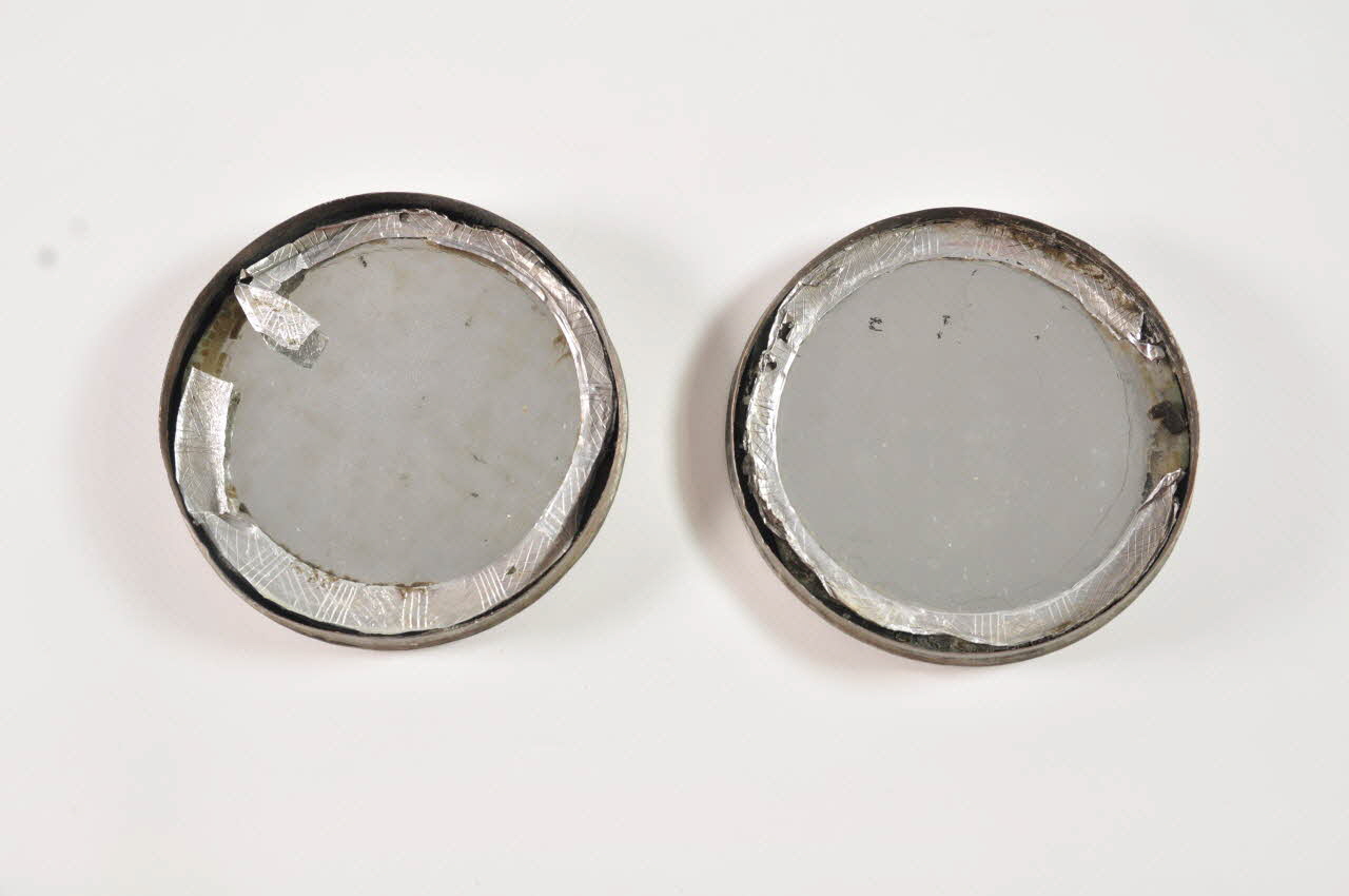 Un des deux miroirs se détache : il est supposé rester assemblé à son couvercle, mais des altérations l'ont désolidarisé de son support.Matériaux et techniques