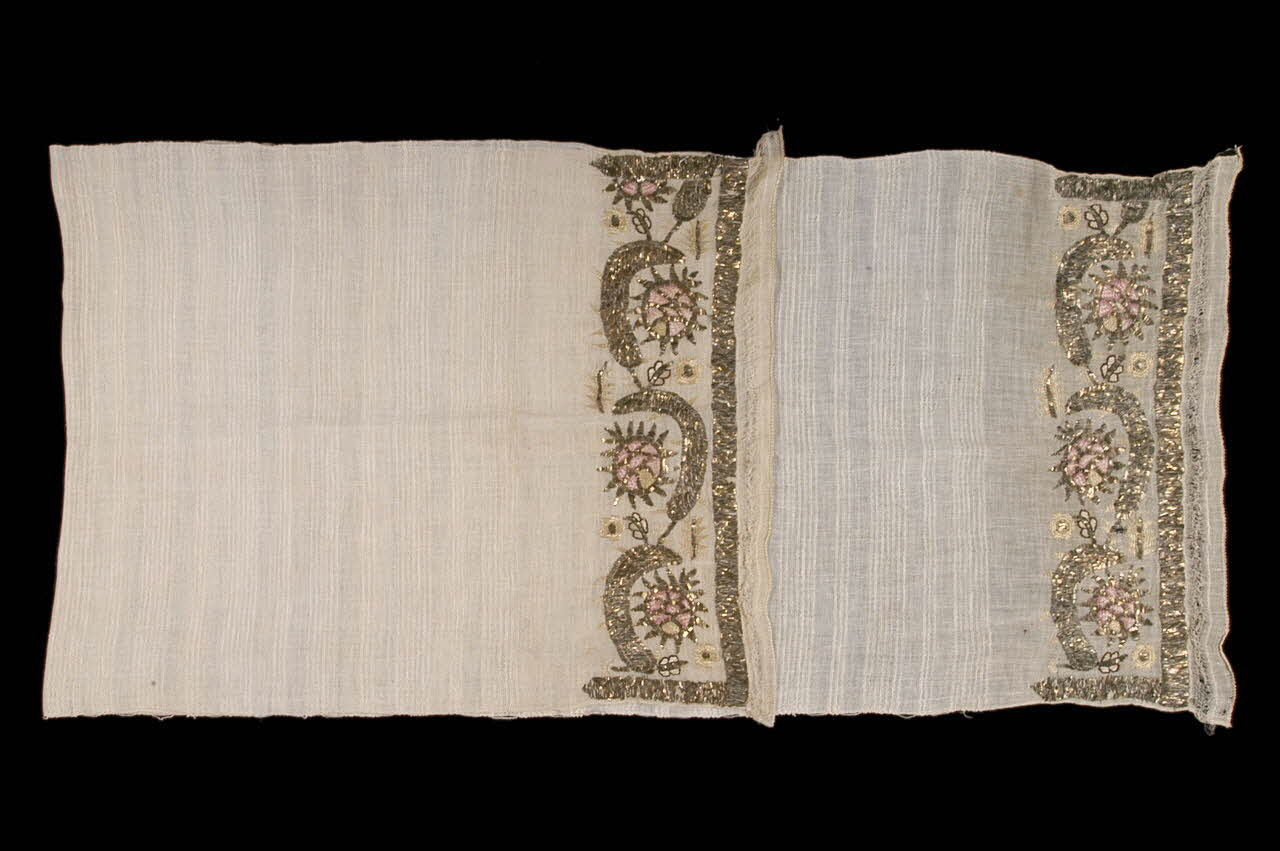 2003.26.10 : Serviette brodée aux deux extrémités de motifs de soleil roses et jaunes et de motifs de croissants, brodés de lames d'or, avec papillons, fleurettes et scorpions.