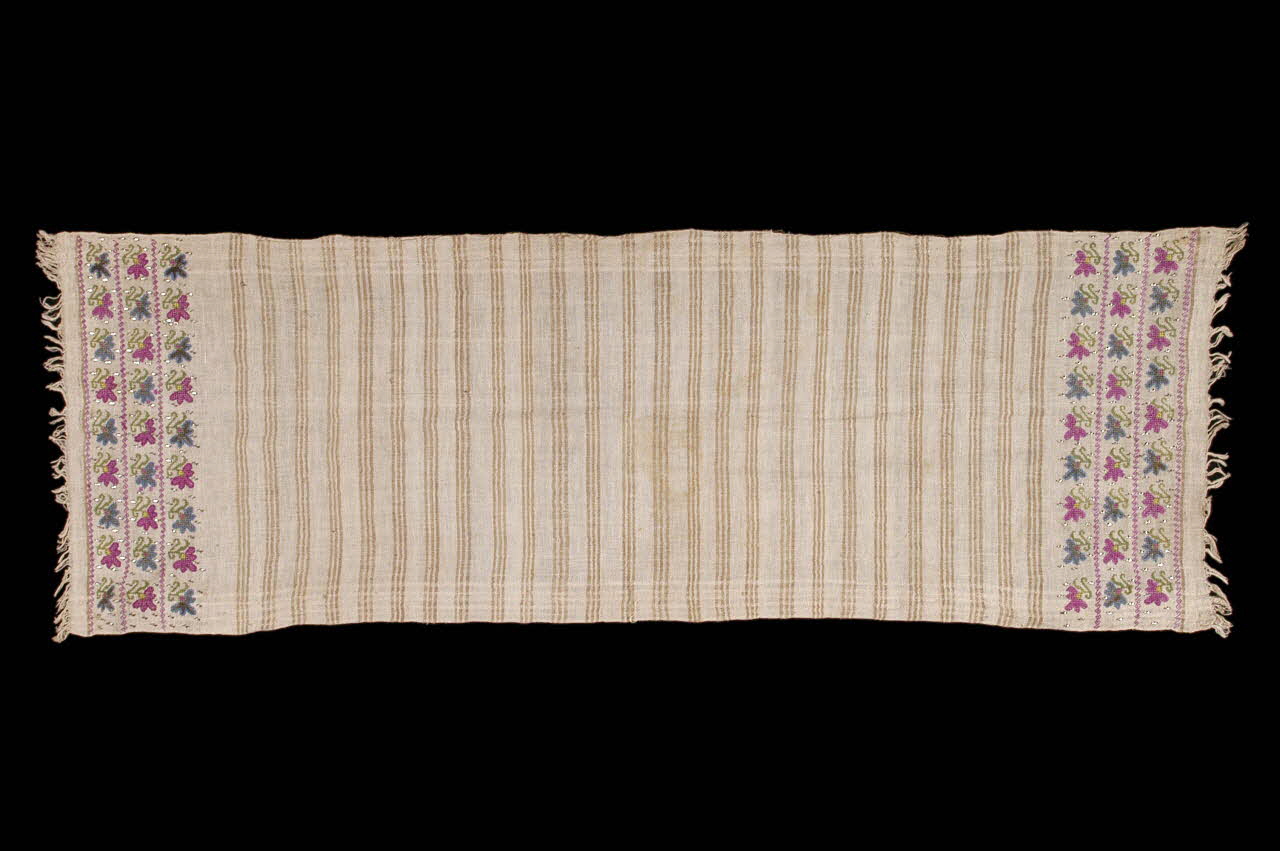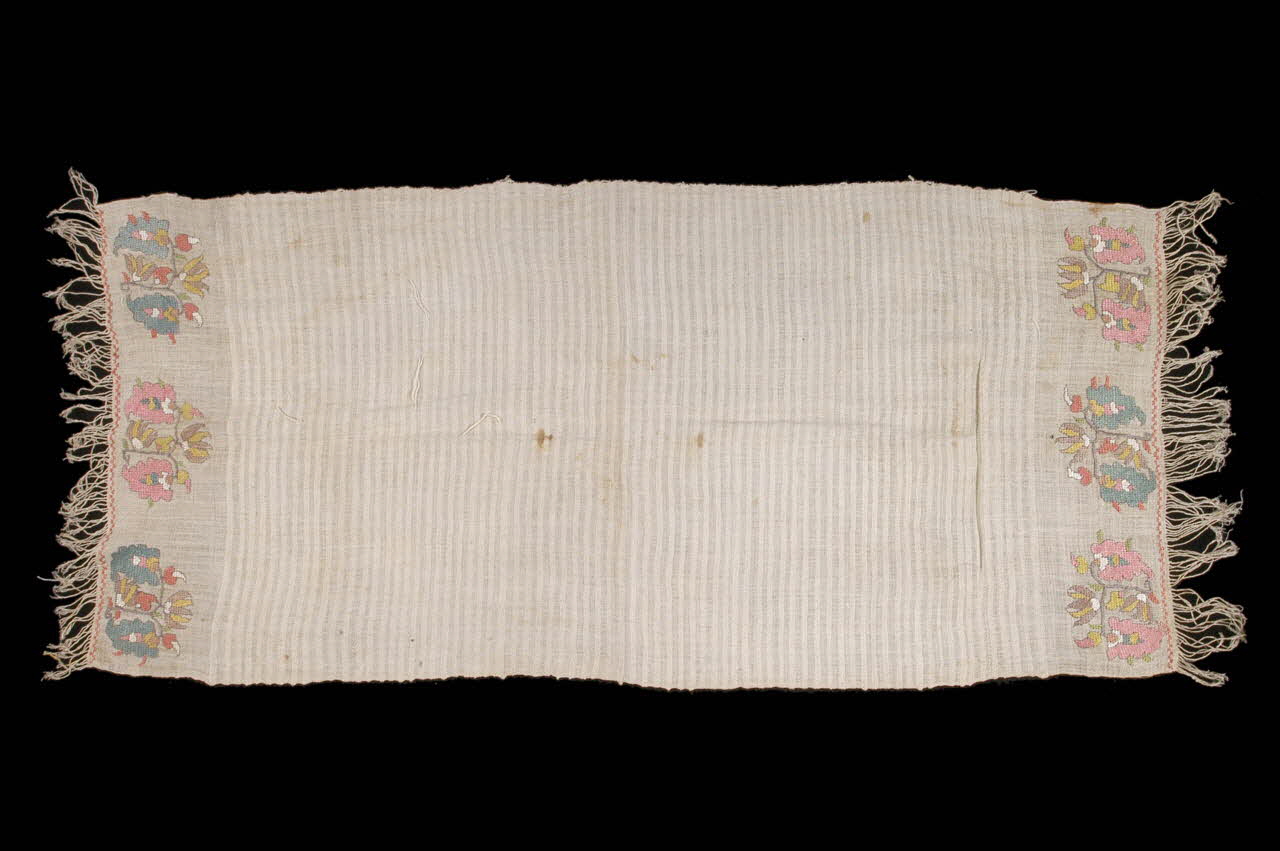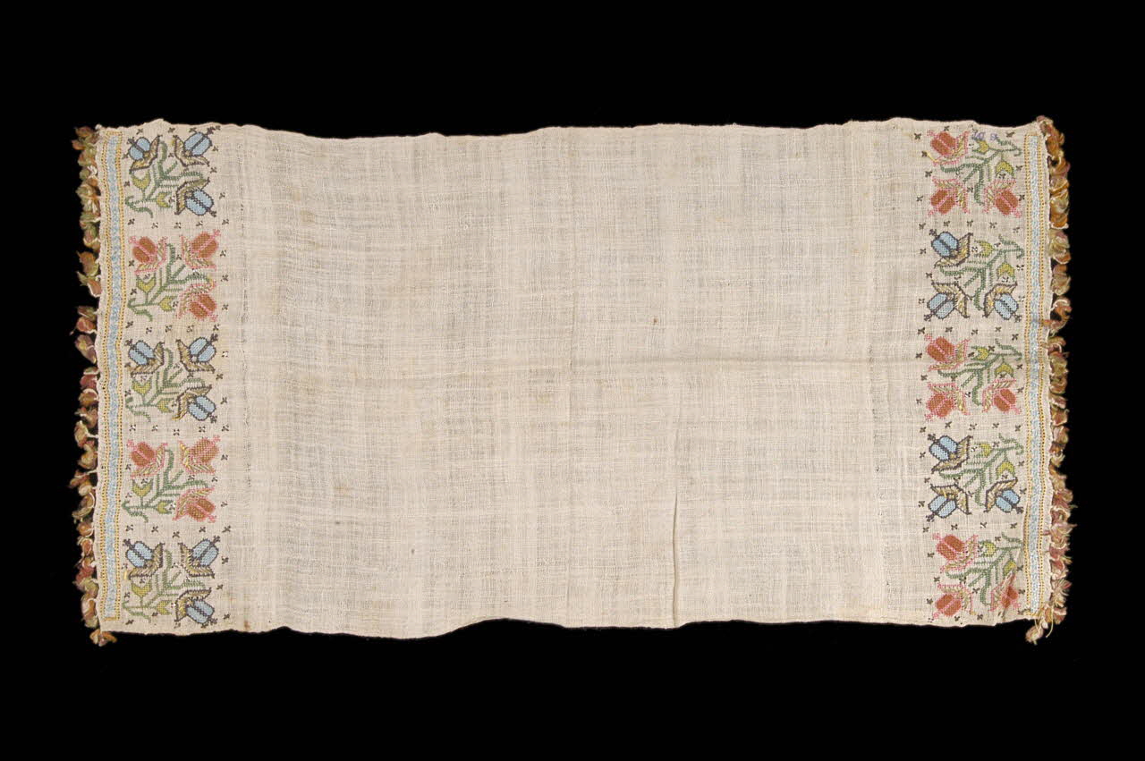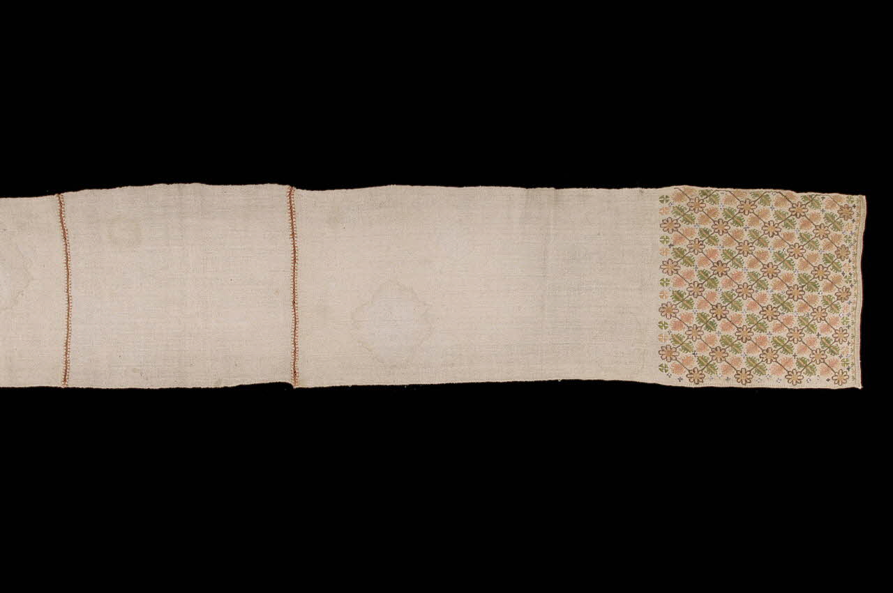 2003.26.7 : Serviette faite de 3 pièces assemblées et brodées aux extrémités de fleurettes et de feuilles roses et vertes, disposées en treillis diagonal. Broderie au point de croix, terminée par des croix grecques.