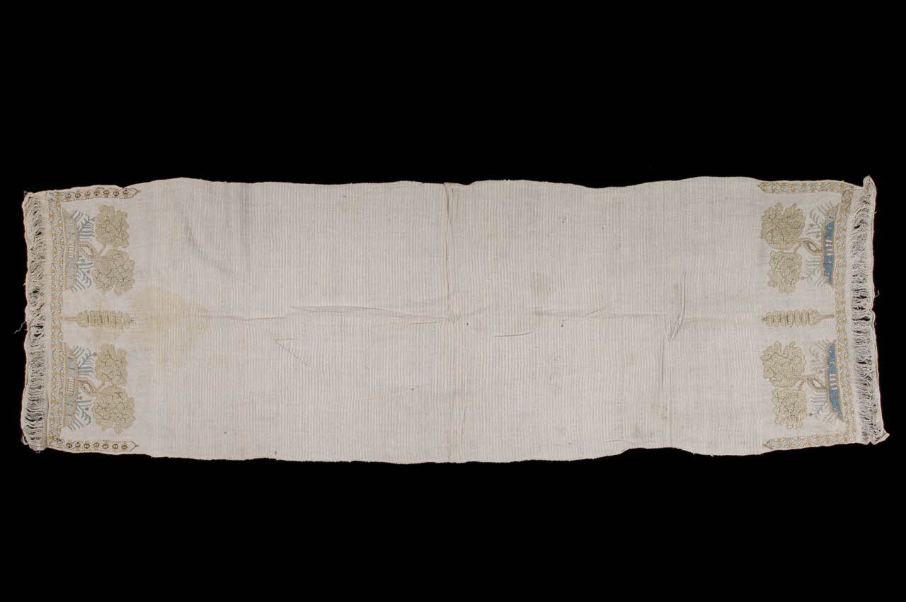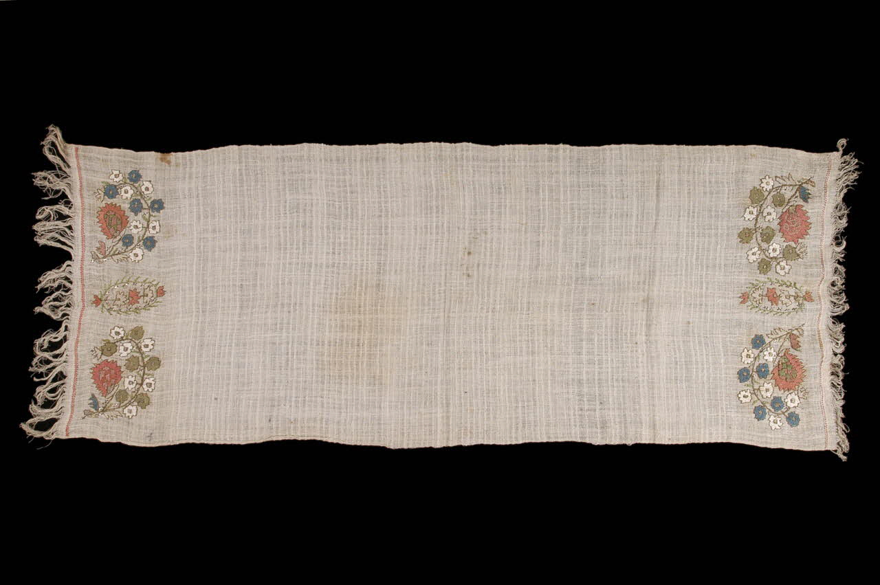 2003.26.4 :Serviette brodée aux deux extrémités de deux branches fleuries à fleurs blanches, bleues et rouges saumon, séparées par un médaillon fleuri
