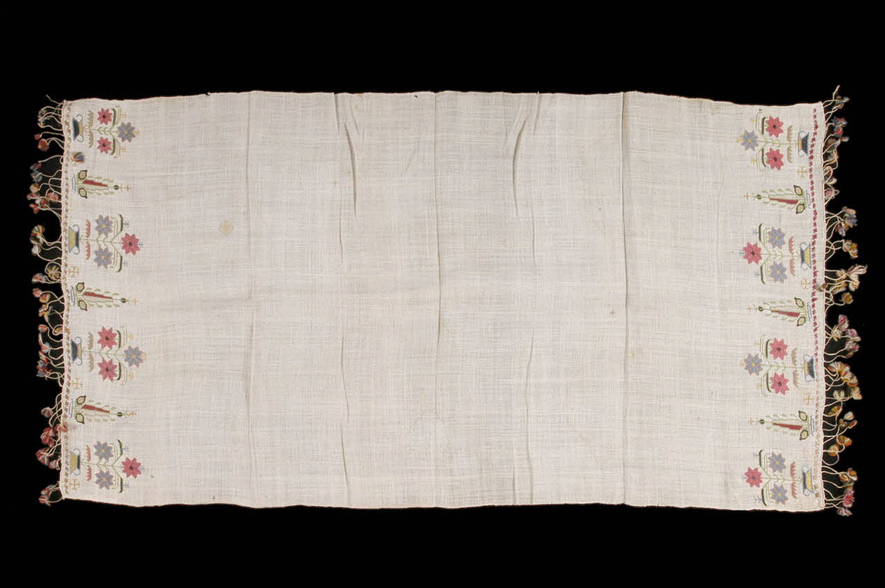 2003.26.6 :Serviette brodée au point de croix de bouquets de fleurs géométrisées séparées par des arbustes et des croix potencées. Frange de pampilles multicolores aux extrémités