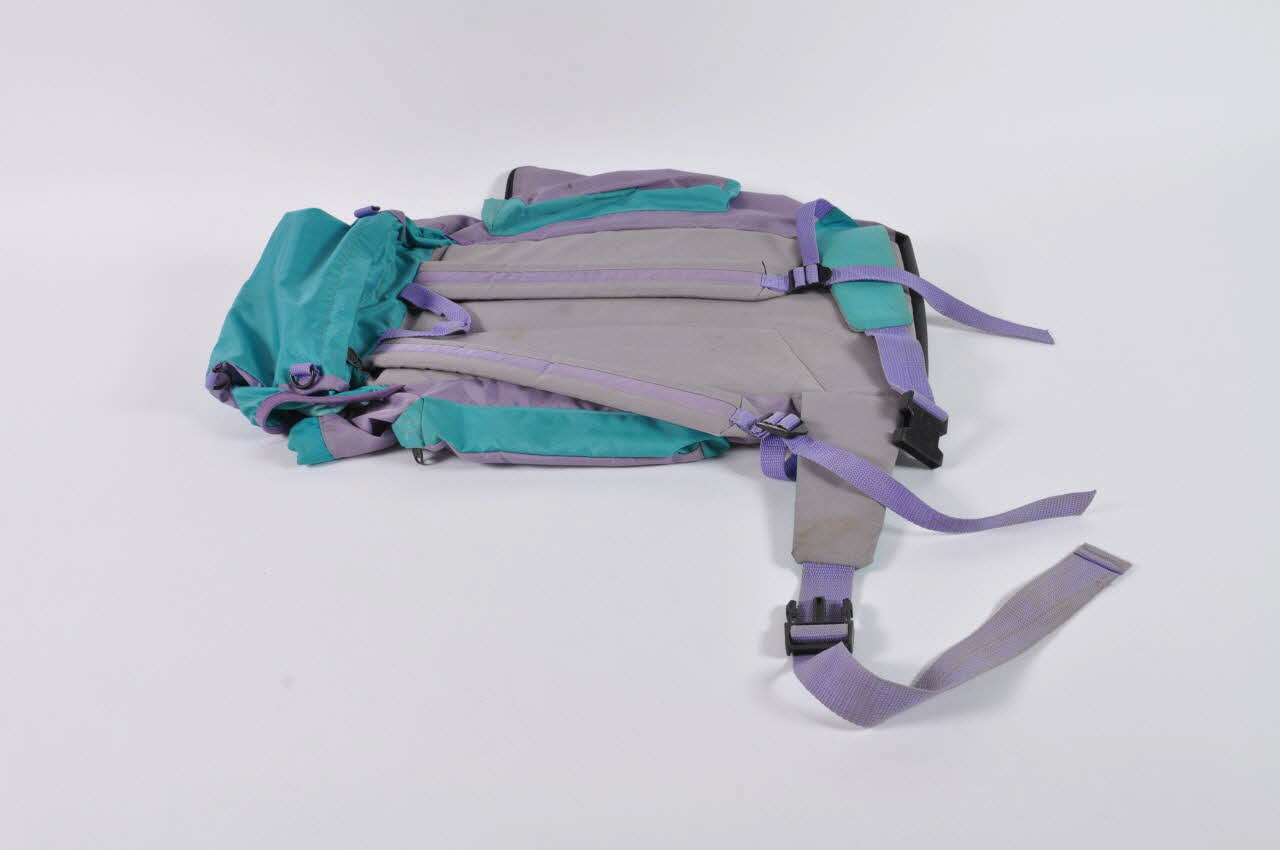 Sac à dos de randonnée, en tissu synthétique vert d'eau, violet et gris, à deux bretelles et une ceinture, fermée par un clip en plastique noir. Le sac se ferme par une sangle passée dans une coulisse, et un rabat fermé par deux clips en plastique noir. Trois poches fermées par des fermetures éclair sont plaquées sur les côtés et l'avant du sac.