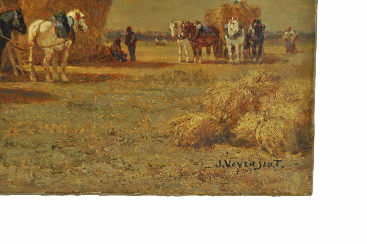 n° 1796 (Une étiquette en papier est collée sur l'angle supérieur droit sur le revers du tableau, sur un des montants.), reversVEYRASSAT // // La moisson // // 985.9.1 (Une étiquette blanche est collée sur la partie centrale d'un des montants et présente des inscriptions imprimés et une chiffre manuscrit.), reversSignature