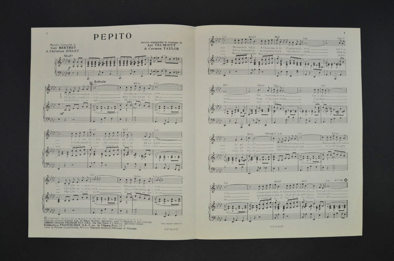 Des inscriptions renseignent le titre, les auteurs, les exécutants et l'éditeur. A l'intérieur et au dos, la partition et les paroles de la chanson.Matériaux et techniques