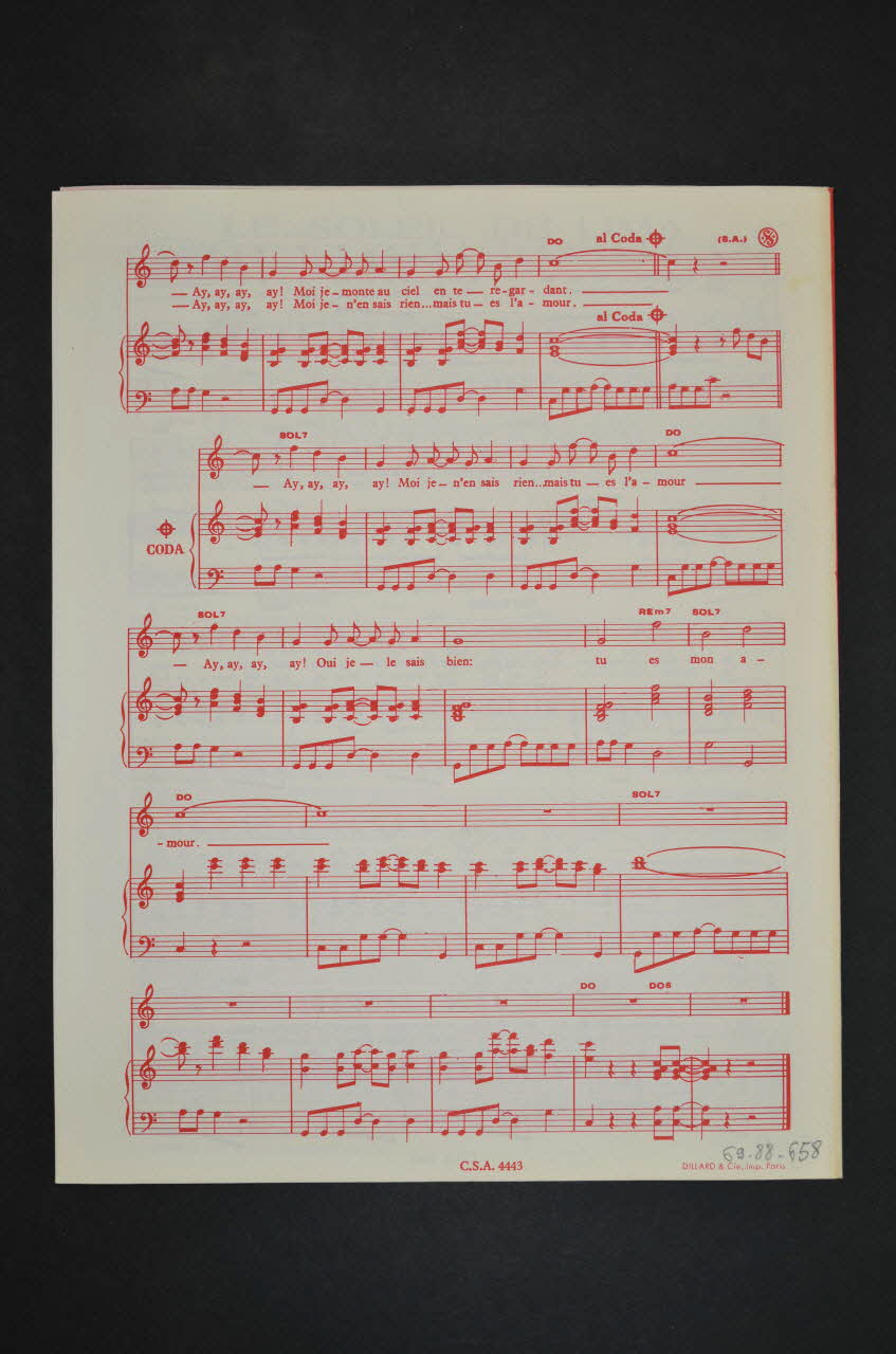 Les inscriptions renseignent le titre de la chanson, le nom des auteurs, de l'artiste et de l'éditeur. A l'intérieur et au dos, la partition et les paroles de la chanson.Matériaux et techniques