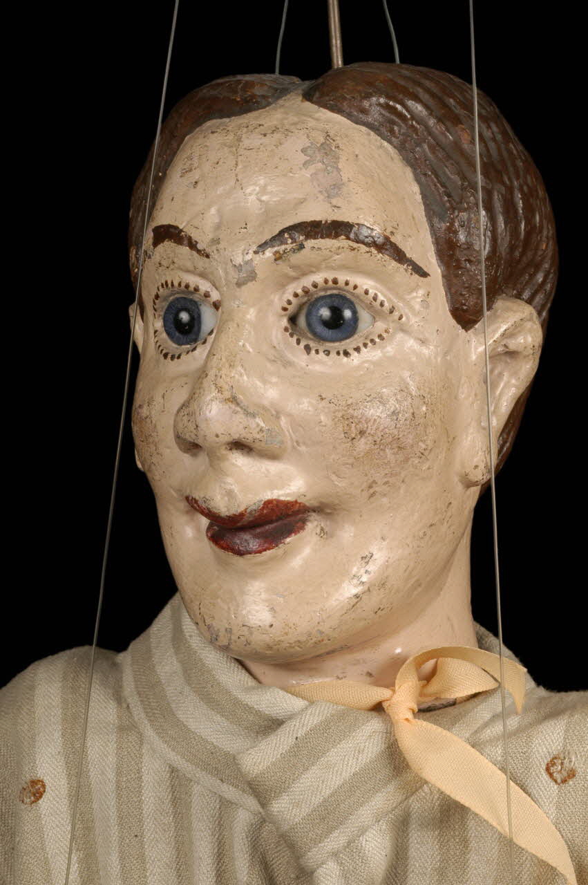 yeux de verre, jambes gainées de marron, longue tunique rayée / La marionnette représente un jeune homme à chevelure brune, yeux de verre, jambes gainées de marron. Le costume est une longue tunique beige à rayures verticales blanches. Une corde lui ceint la taille.Matériaux et techniques