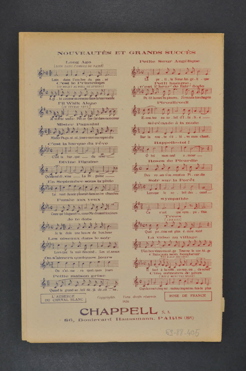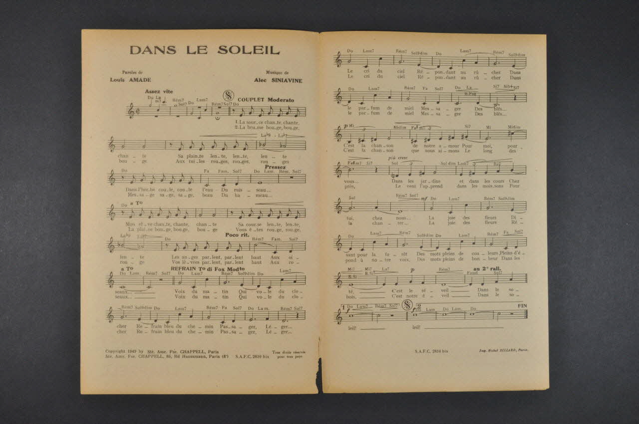 La première page présente la photographie de Jean Lambert. Les inscriptions précisent le titre de la chanson, l'auteur et l'éditeur. A l'intérieur se trouvent la partition et les paroles de la chanson. Au dos, une liste de morceaux disponibles chez le même éditeur.Matériaux et techniques