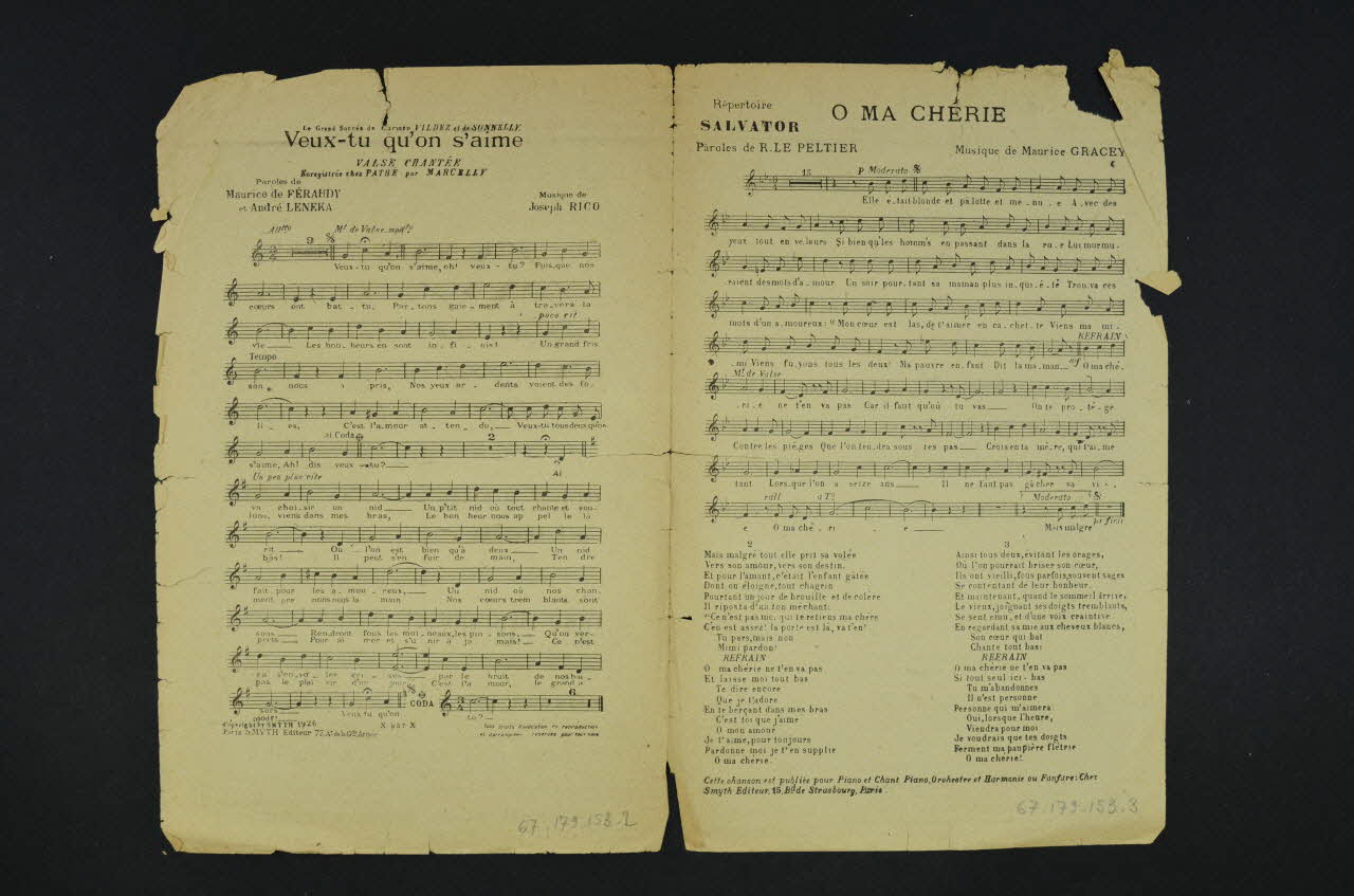 Les inscriptions précisent l'auteur de la chanson, les interprètes et l'éditeur du feuillet. L'intérieur et le dos comportent la partition et les paroles.Matériaux et techniques