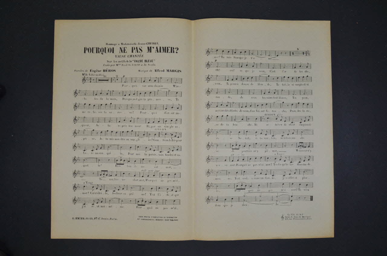 Des inscriptions renseignent le titre, les auteurs, les exécutants et l'éditeur. A l'intérieur, partition et paroles de la chanson. Au dos, liste des chansons de Krier.Matériaux et techniques