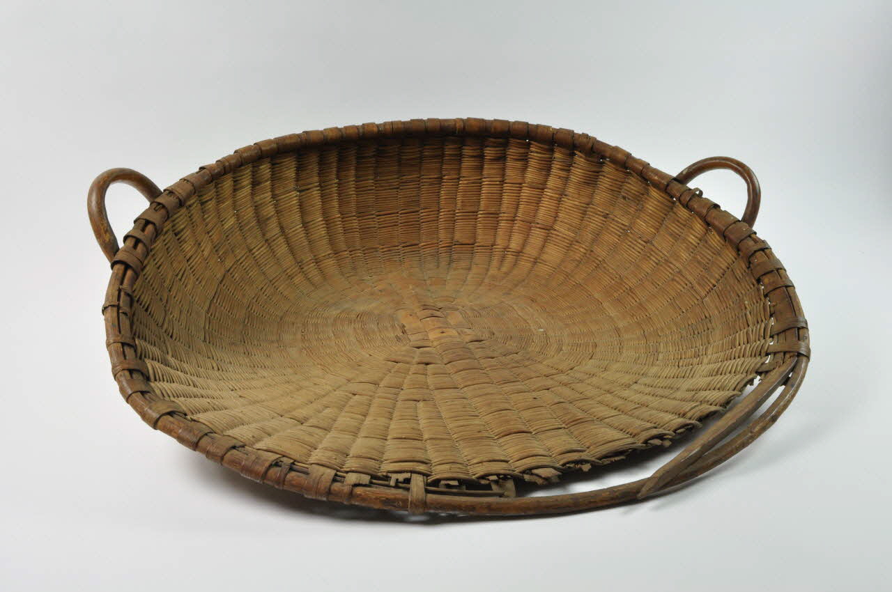 En bois tissé, circulaire. Le fond est plat, et le bord remonte, arrondi, sur une moitié de l'objet et est muni de deux poignées.Matériaux et techniques