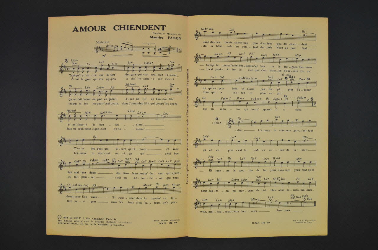Les inscriptions renseignent le titre de la chanson, le nom des auteurs, de l'artiste et de l'éditeur. A l'intérieur, partitions et paroles de la chanson. Au dos, un tableau pratique pour apprendre la guitare.Matériaux et techniques