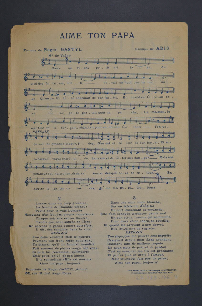 Feuillet rectangulaire en papier industriel, imprimé à l?encre bleue et comprenant les paroles et partitions de trois chansons.