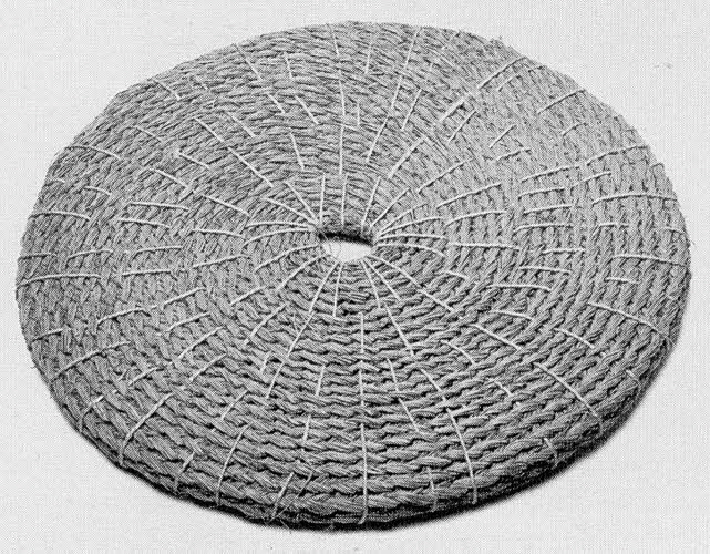 Jonc tressé renforce par des brins de ficelle, à départ rayonnant à partir d'un évidement central, avec une face interne garnie de brins laissés libres.Matériaux et techniques