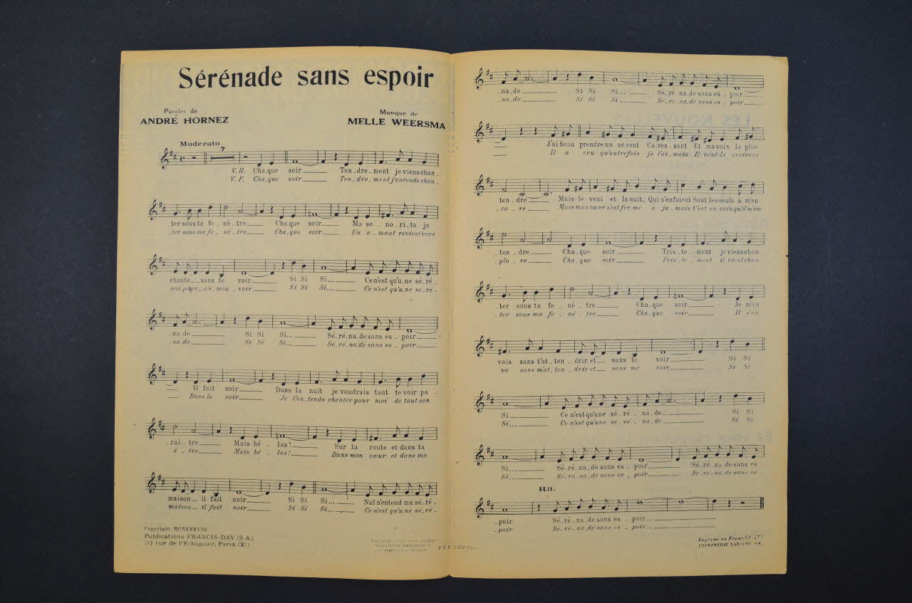 Sur la couverture, les portraits photographiques de Tino Rossi, Georges Marow, Rina Ketty, Lucienne Delyle, Yolanda et le Chanteur sans nom avec étoiles dans le champ. Les inscriptions renseignent le titre de la chanson, le nom des auteurs, des artistes et de l'éditeur.