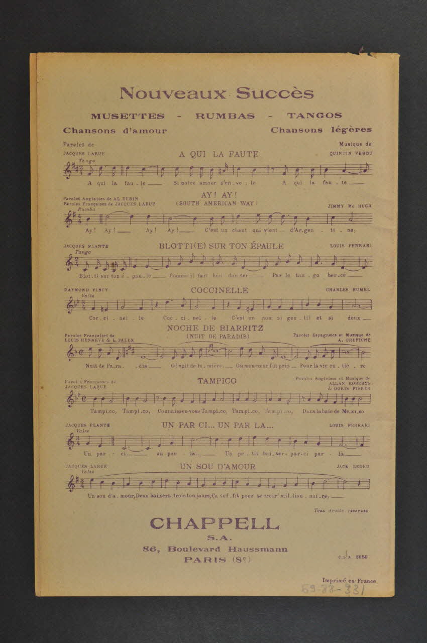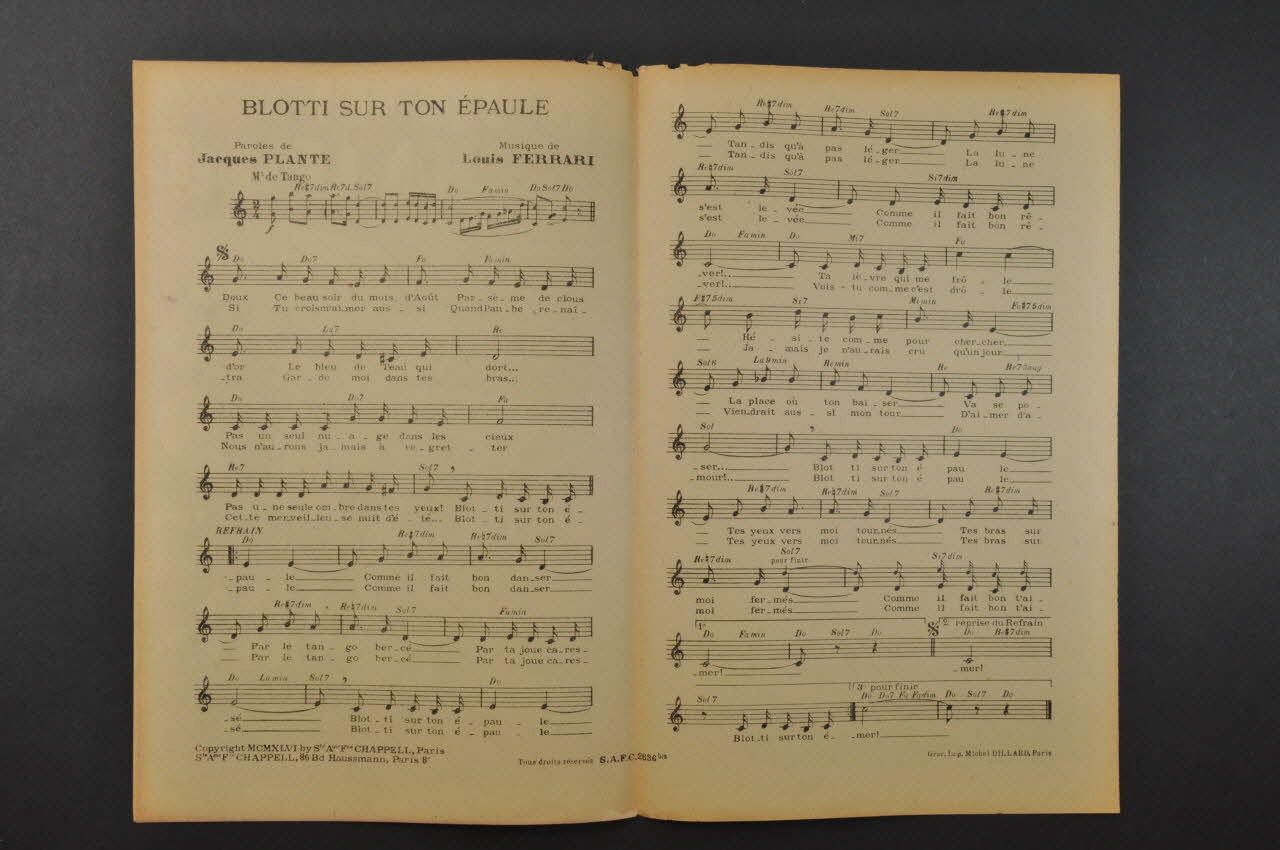 Des inscriptions renseignent le titre, les auteurs, les exécutants et l'éditeur. A l'intérieur, partition et paroles de la chanson. Au dos, liste d'autres partitions publiées par l'éditeur.Matériaux et techniques