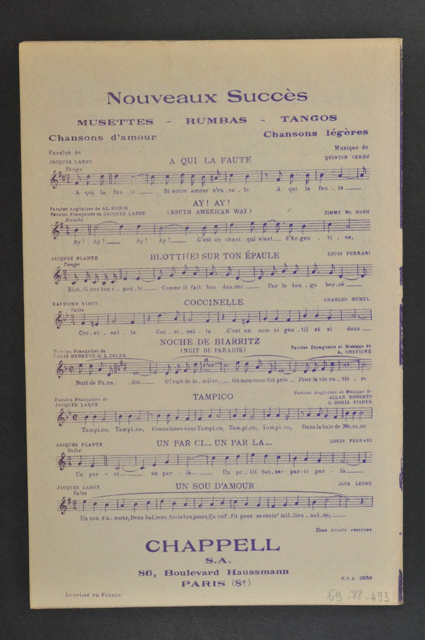 Des inscriptions renseignent le titre, les auteurs, les exécutants et l'éditeur. A l'intérieur, partition et paroles de la chanson. Au dos, liste d'autres partitions publiées par l'éditeur.Matériaux et techniques