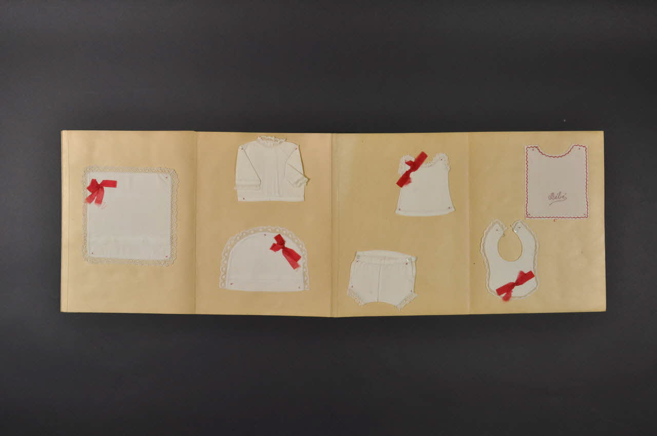 Longue bande de carton beige, repliée en accordéon, sur laquelle sont des modèles de couture : un mouchoir en coton blanc bordé de rouge, des plastrons, des cols, des manches, une chemisette, une culotte, des bavettes. Utilisé en milieu scolaire élémentaire.Matériaux et techniques