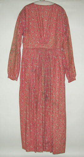 Toile de coton teinte imprimée; à doublure en toile de lin ou de chanvre, fond rose, fleurs rouges et vertes. / Encolure bateau, sans col, ouverture dans le dos, partant de l'encolure avec attaches métalliques et bouton pour la fermeture.
