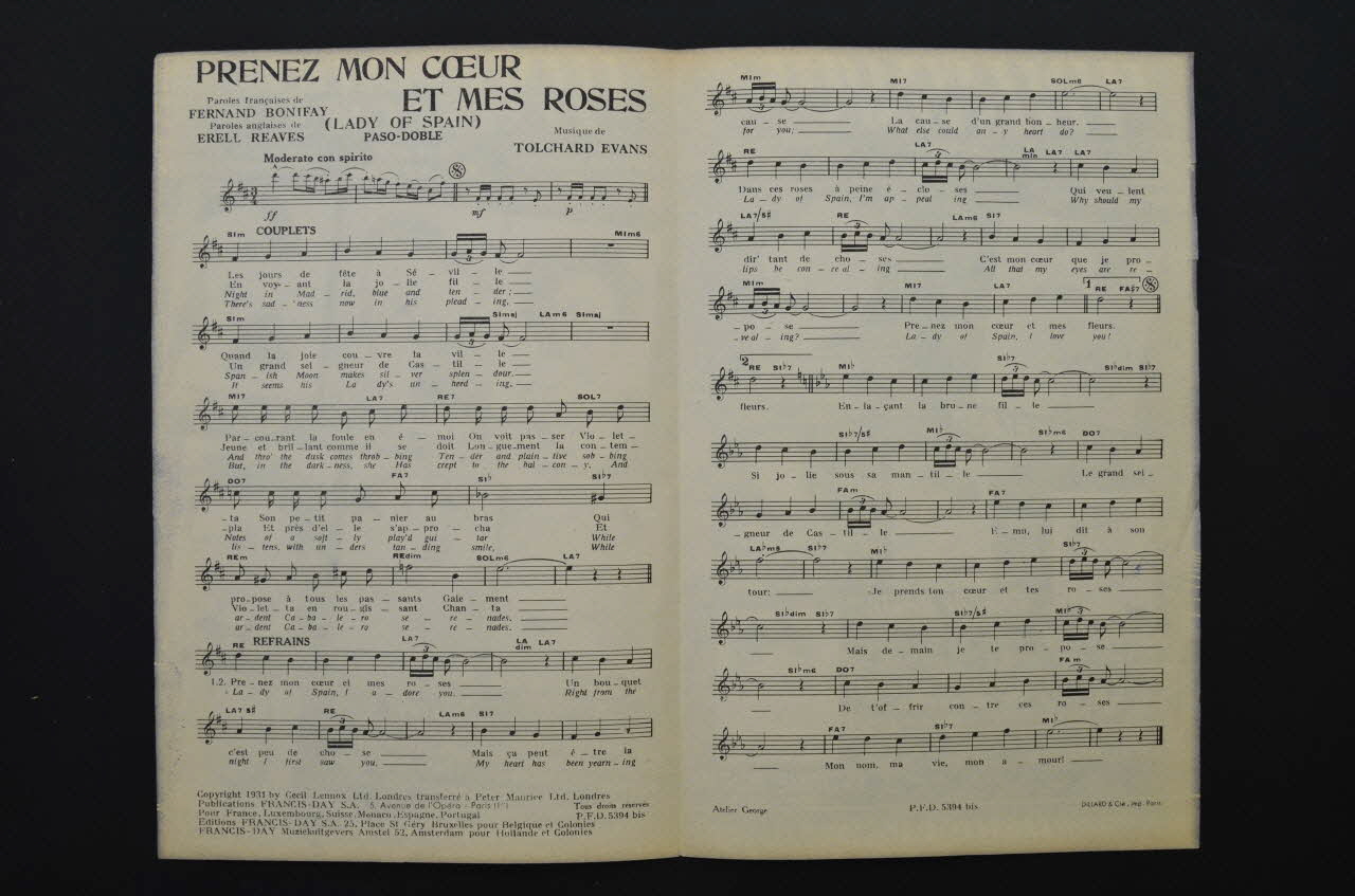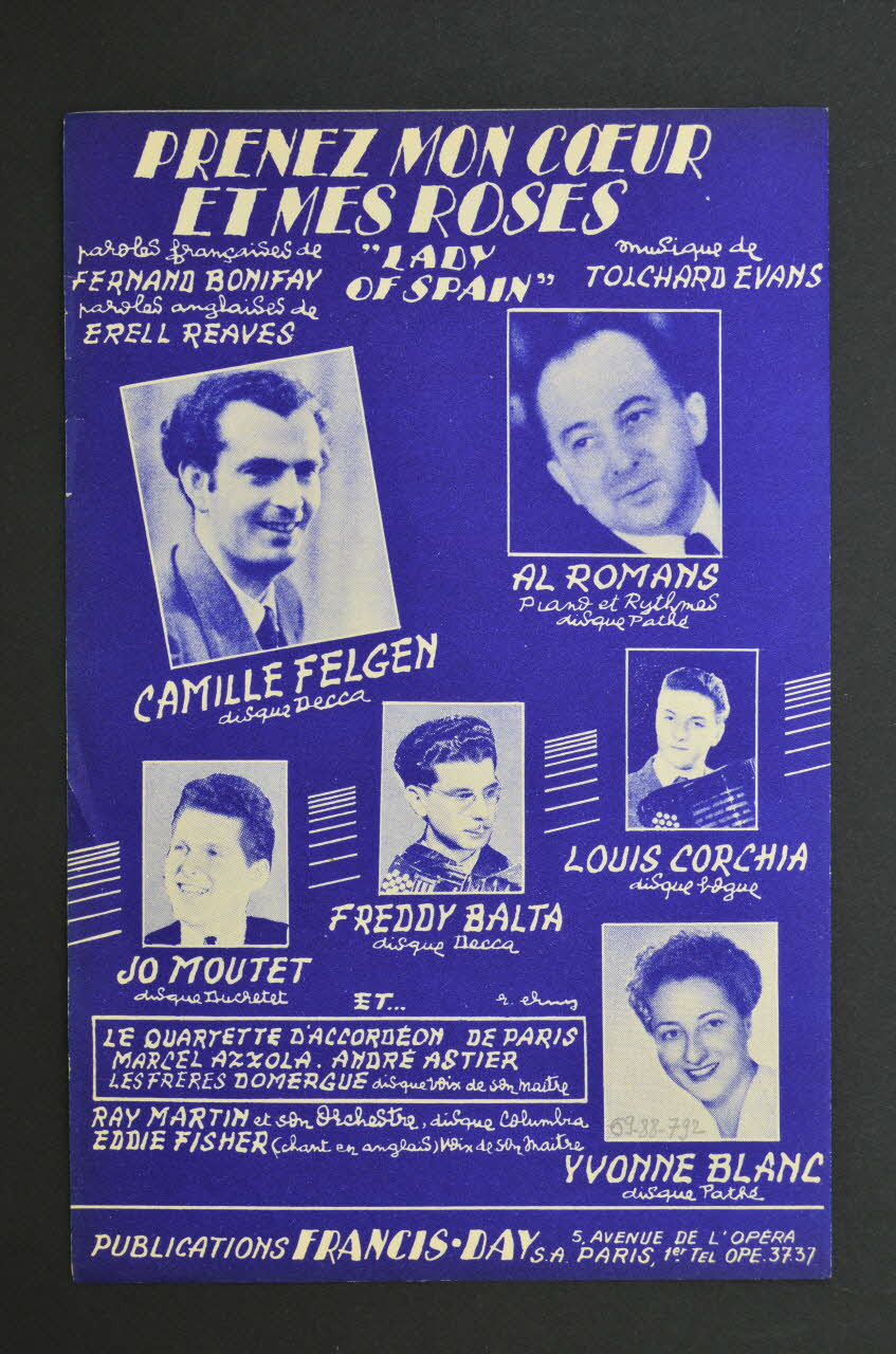Sur la couverture, les portraits photographiques de Marie-José, Verlor et Davril, Jacques Hélian, Lucienne Delyle, Aimé Barelli, Yvette Horner et Noël Chiboust. Au dos, les portraits photographiques de Camille Felgen, Al Romans, Jo Moutet, Freddy Balta, Louis Corchia et Yvonne Blanc. Les inscriptions renseignent le titre de la chanson, le nom des auteurs, des artistes et de l'éditeur.