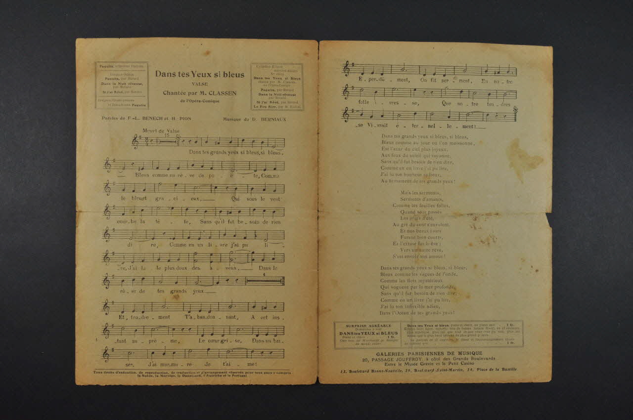 Les inscriptions précisent l'auteur de la chanson, les interprètes et l'éditeur du feuillet. L'intérieur comporte la partition et les paroles. Au dos, une liste d'autres titres disponibles chez le même éditeur.Matériaux et techniques