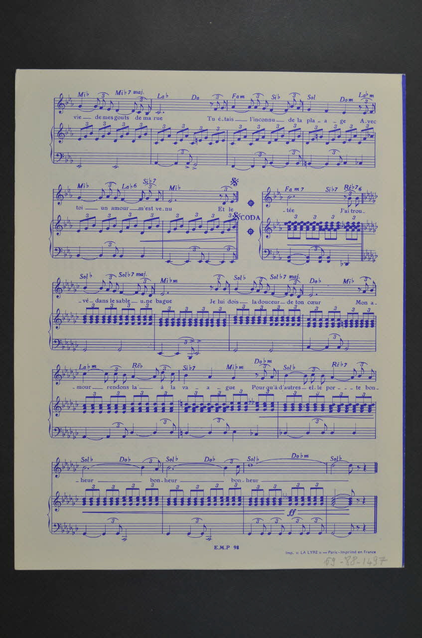 Les inscriptions renseignent le titre de la chanson, le nom des auteurs, de l'artiste et de l'éditeur. A l'intérieur et au dos, la partition et les paroles de la chanson.Matériaux et techniques