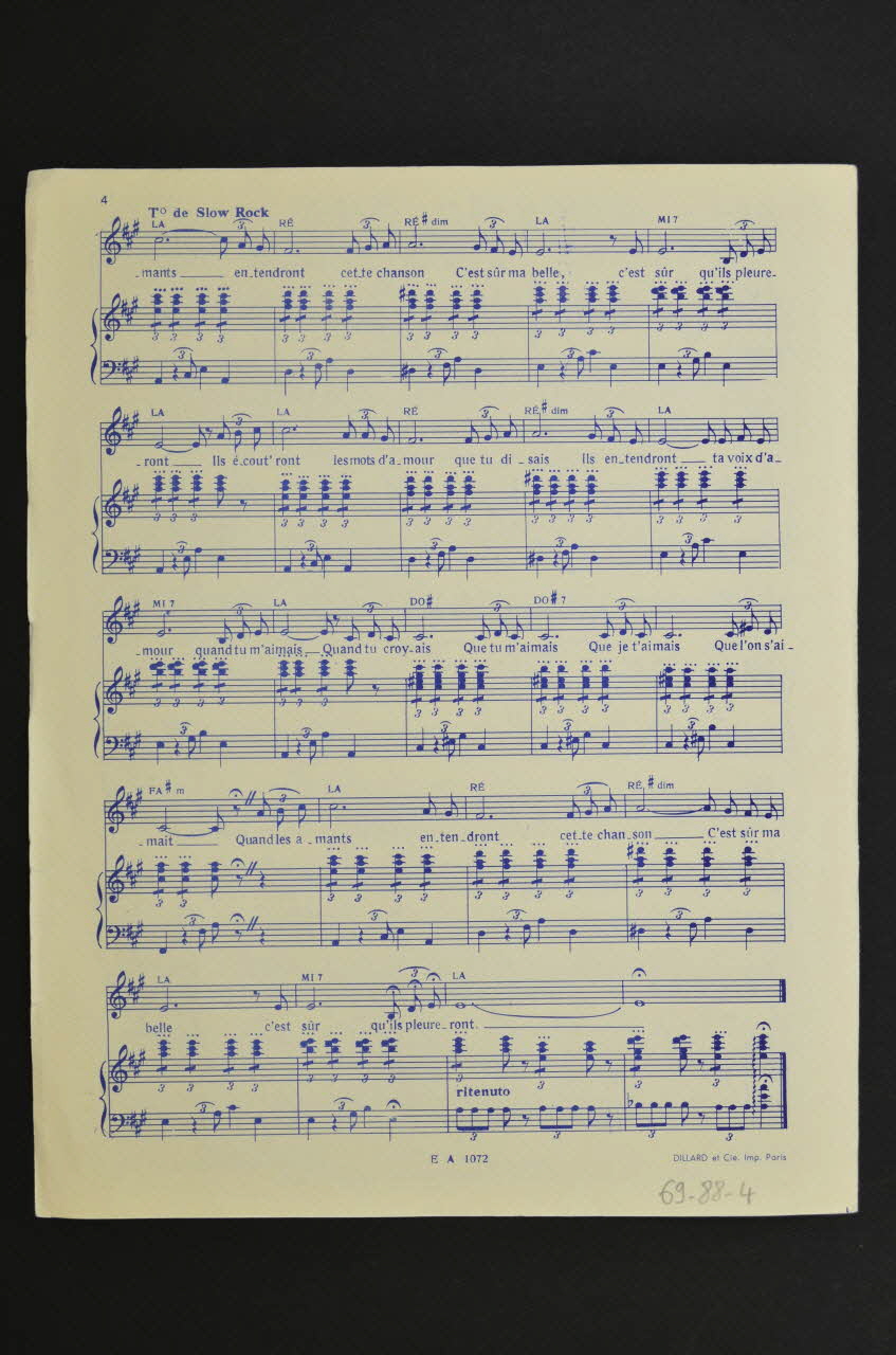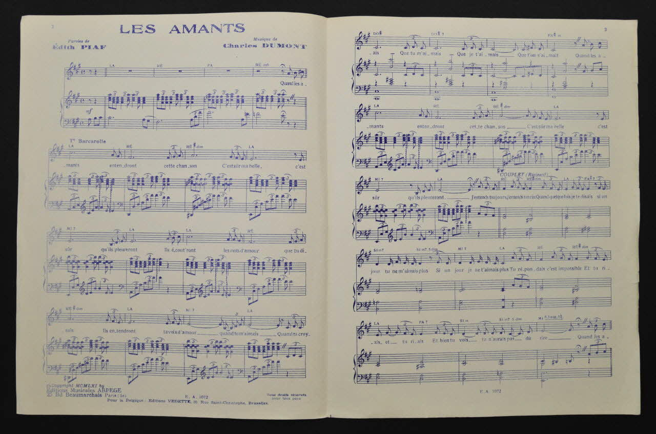 Sur la couverture, les portraits photographiques de Charles Dumont et d'Edith Piaf ; encadrement à motifs de pointillés. Les inscriptions renseignent le titre de la chanson, le nom des auteurs, des artistes et de l'éditeur. A l'intérieur et au dos, partition et paroles de la chanson.Matériaux et techniques