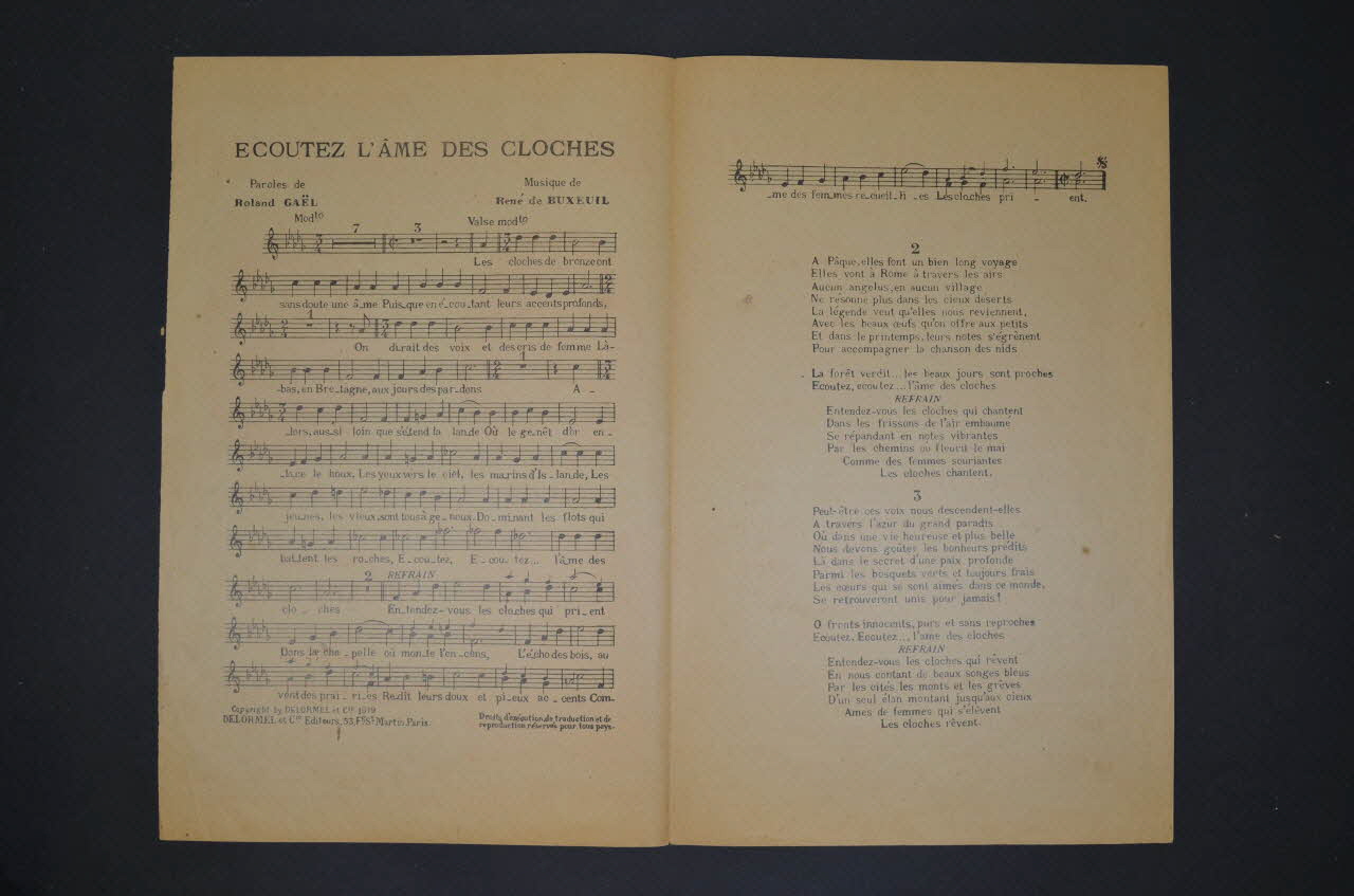 Sur la couverture, les portraits photographiques en médaillon de Junka et Resca, au-dessous, celui, rectangulaire, de René de Buxeuil jouant du piano. Les inscriptions renseignent le titre de la chanson, le nom des auteurs, des artistes et de l'éditeur.