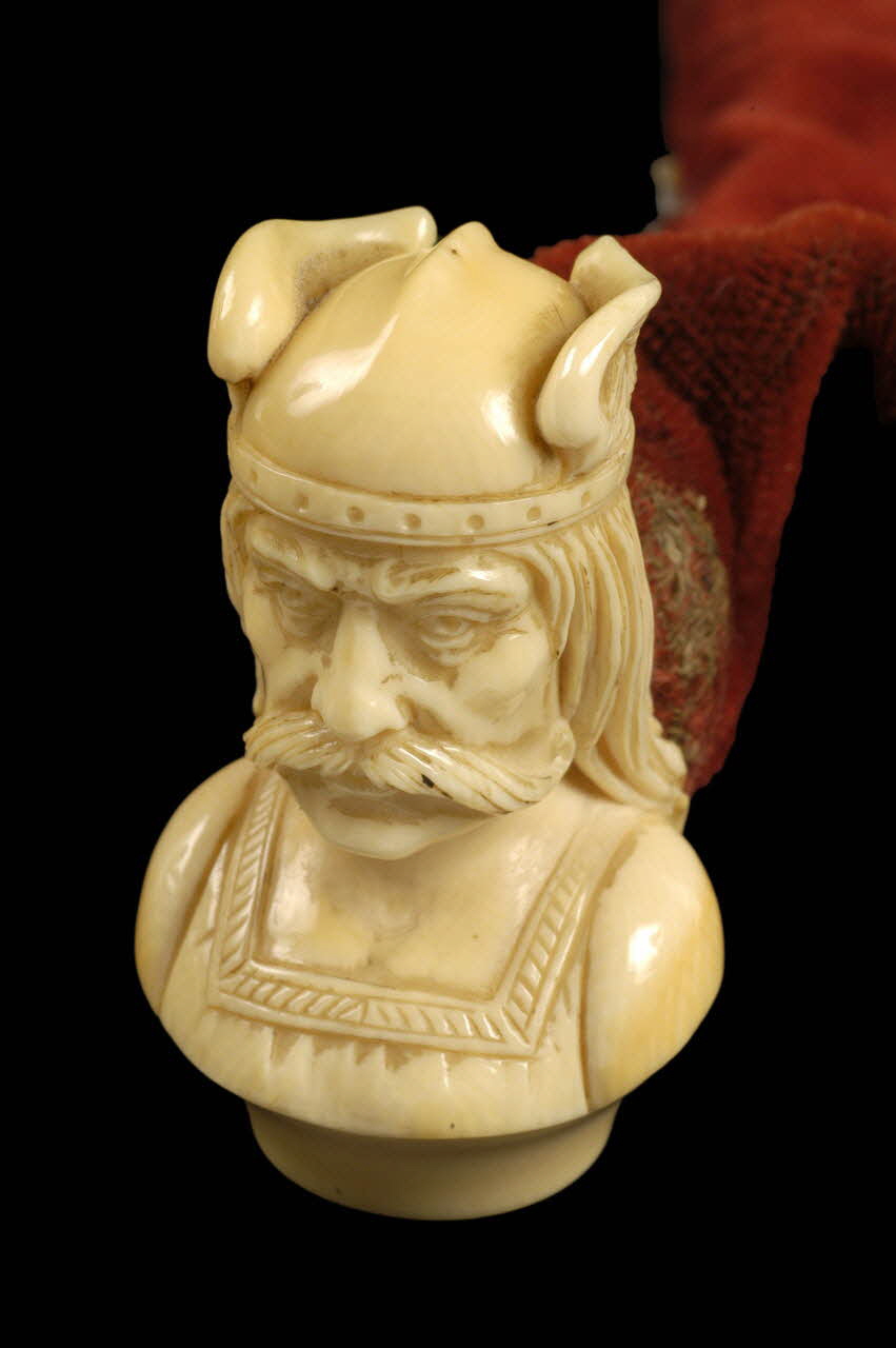 La peau est recouverte d'une poche en velours rouge fermée par dix boutons de nacre. La souche de tête, en forme de tête de gaulois, est en ivoire de même que le tuyau de raccordement. Les pièces d'ivoire de ce tuyau ont été récupérées sur un hautbois. Le segment intermédiaire en caoutchouc est recouvert de velour rouge. La souche du tuyau d'insufflation est en érable. / sac de cabrette recouvert de velours rouge avec souches dont l'une en forme de tête de gauloisMatériaux et techniques
