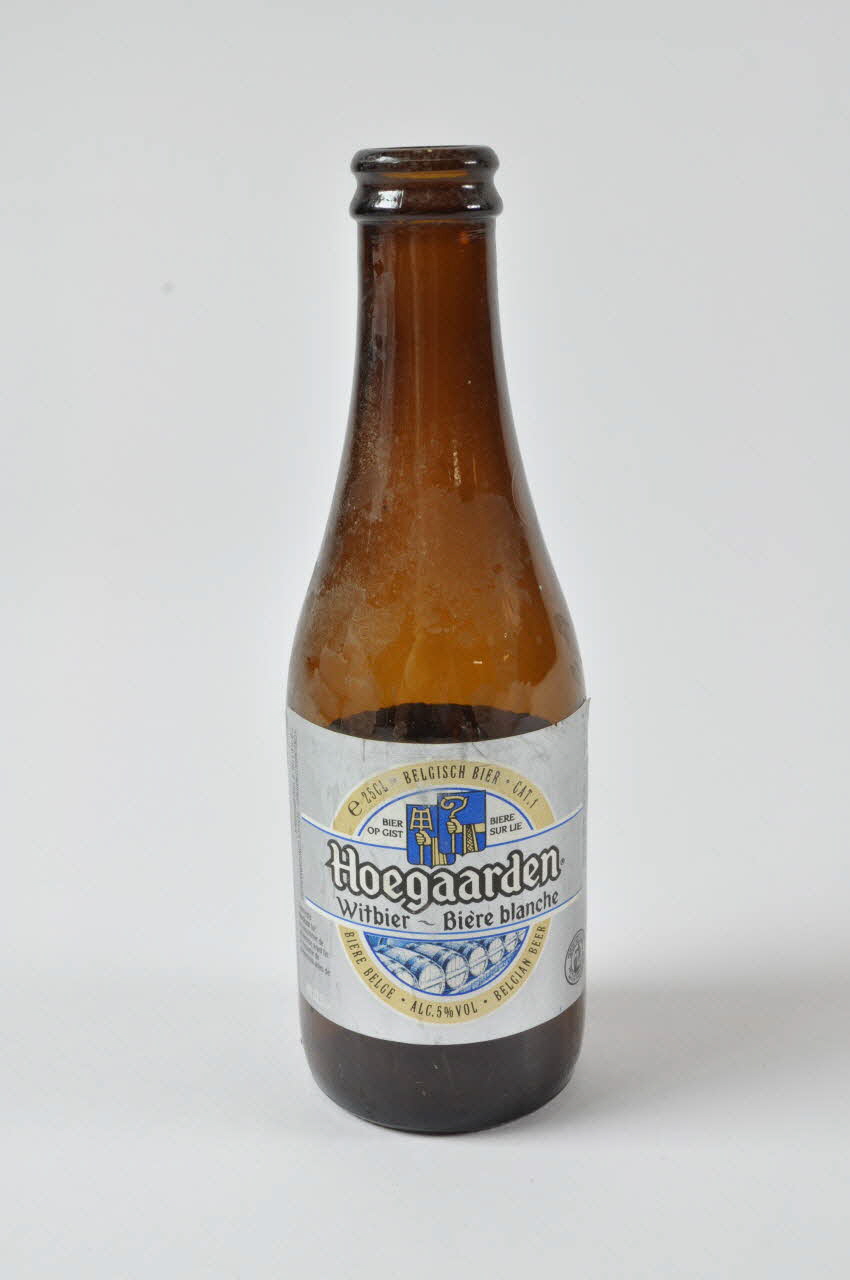 Hoegaarden / Berceau de la Bière Blanche. / La recette de Hoegaarden date de 1445. C'est une / bière à base de froment qui est naturellement voilée car / non filtrée lors de la mise en bouteille. Bière sur lie, le / dépôt au fond de la bouteille témoigne de sa qualité. Elle / est exceptionnellement rafraîchissante, facile à boire, et / ne titre que 5% alcool en volume. Hoegaarden s'apprécie / pleinement à une température de 4°C. / ALC. 5% VOL. 25cl. e, dosMatériaux et techniques