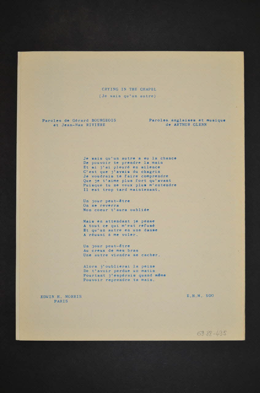 Les inscriptions renseignent le titre de la chanson, le nom des auteurs, de l'artiste et de l'éditeur. A l'intérieur, partitions et paroles de la chanson. Au dos, les paroles.Matériaux et techniques
