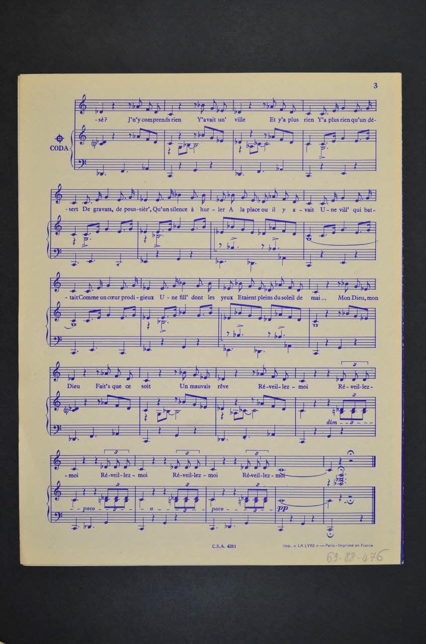 Des inscriptions renseignent le titre, les auteurs, les exécutants et l'éditeur. A l'intérieur et au dos, la partition et paroles de la chanson.Matériaux et techniques