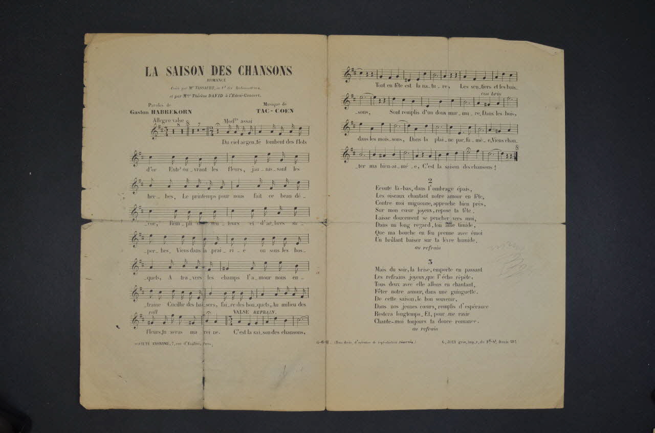 Les inscriptions renseignent le titre de la chanson, le nom des auteurs, de l'artiste et de l'éditeur. A l'intérieur, partitions et paroles de la chanson. Au dos, liste d?autres partitions publiées par l?éditeur.Matériaux et techniques