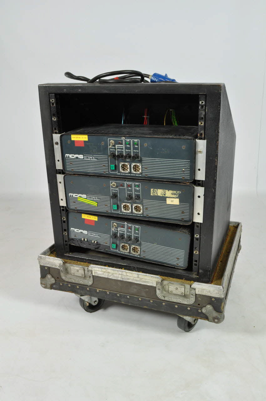 En façade dix prises électriques blanches, bouton rouge d'alimentation et deux prises " OUT PUTS". Au dos, trois bornes d'alimentation de forme rectangulaire superposées indiquant le voltage et les ampères. Quatre fusibles vide sont collés par un ruban adhésif noir sur la borne inférieure. .2 et .3 : Filght Case monté sur quatre roulettes, capitonné de mousse synthétique à l'intérieur, quatre fermetures à verrouillage et renfort aux arêtes, quatre poignés sur les côtés, un autocollant avec deux flèches rouges indiquant le haut collé sur le côté du couvercle. Au dos, un espace vide dans la partie supérieure. .4 et .5 :Deux câbles retrouvés à l'intérieur du rack, l'un aux embouts entourés de ruban adhésif jaune, l'autre de ruban adhésif rouge.Inscriptions