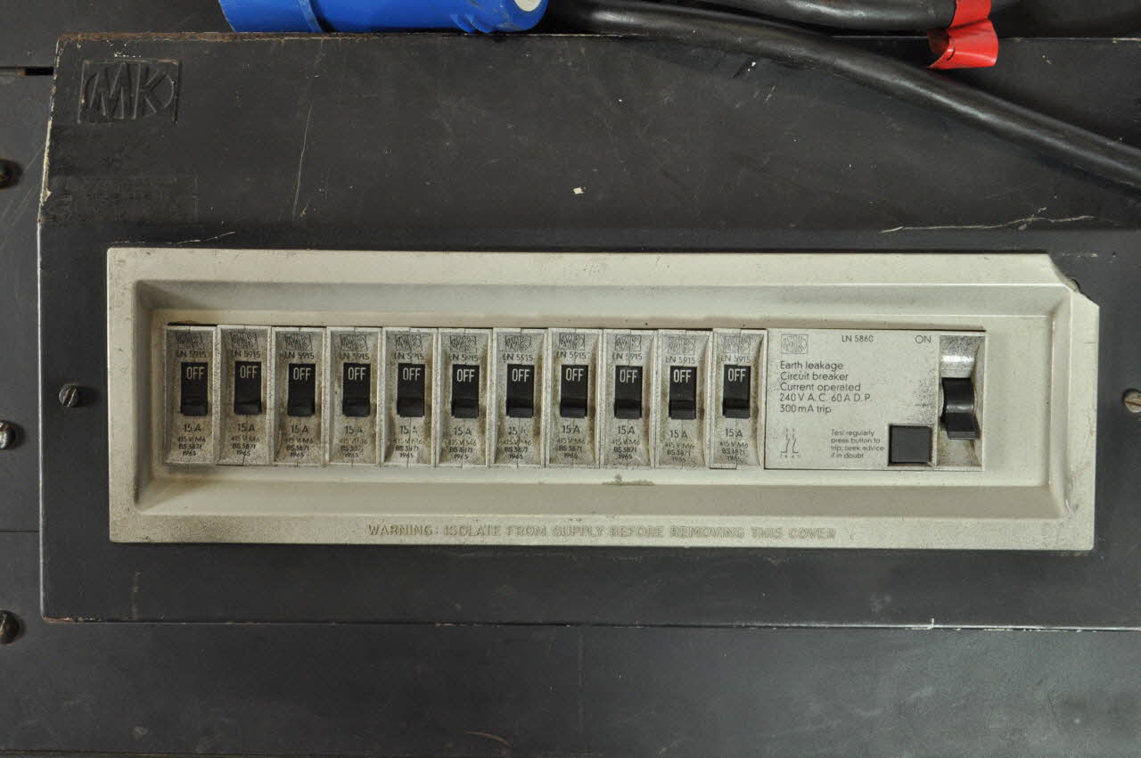 LN 5915 // 15 A // 415 V M6 // BS 3871 // 1965 (imprimé en noir autour des boutons ON/OFF), dessusLN 5860 // Earth Leakage // Circuit Breaker // Current Operated // 240 V A C 60 A D P // 300 A trip (imprimé en noir sur le plastique), dessusInscription