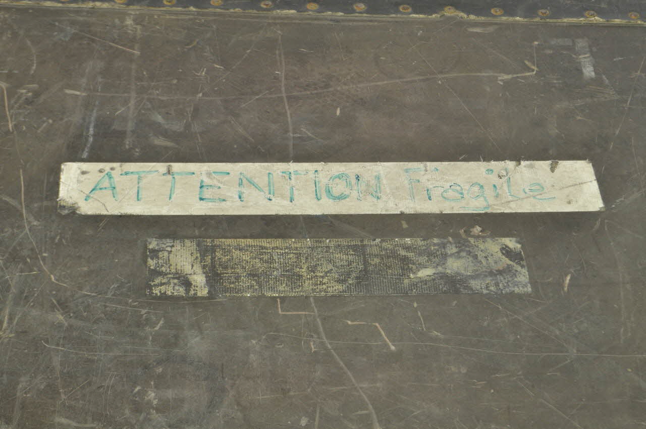 ATTENTION Fragile (Ecrit au feutre vert sur une bande adhésive blanche collé au dessus de la caisse.), dessusRH DESK 21-40 // // LH DESK 1-20 (inscrit en rouge sur étiquette jaune, sur la borne d'alimentation supérieure et inférieure), au dosBRIT ROW LONDON (au pochoir blanc sur le côté du .3), dessusLégende