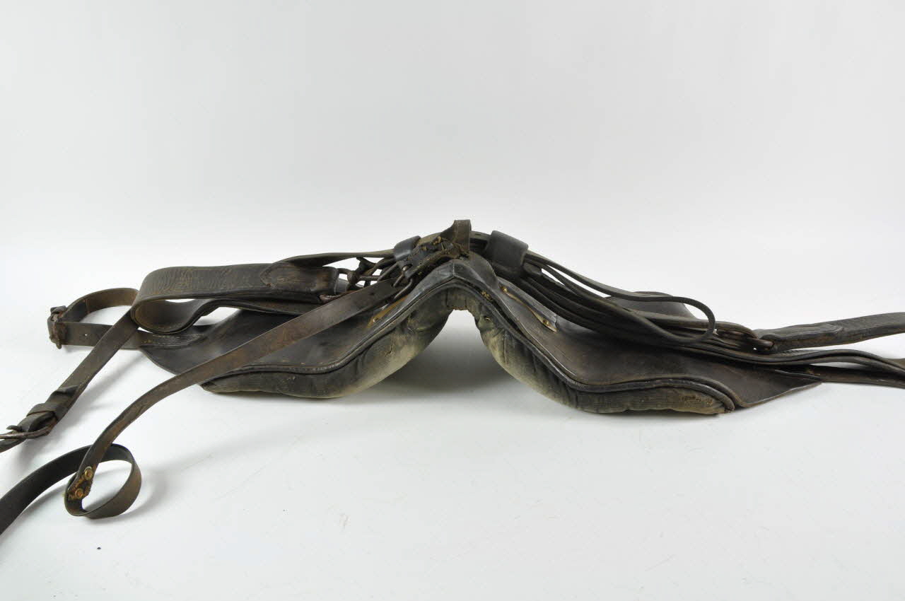Dossière constituée d'un large coussin rectangulaire en toile de coton beige, recouverte d'une épaisse plaque de cuir brun. Elle se prolonge sur les côtés par des sangles de cuir, munies de boucles métalliques à un aiguillon. Deux plaques de cuivre, festonnées, sont clouées sur le dessus de la dossière. Une petite sangle de cuir est clouée sur le sommet de la dossière, formant une boucle, dans laquelle passent les courroies porte-brancard (.2). Celles-ci sont constituées d'épaisses bandes de cuir brun, formant deux boucles sur les extrémités, maintenues par des boucles métalliques.