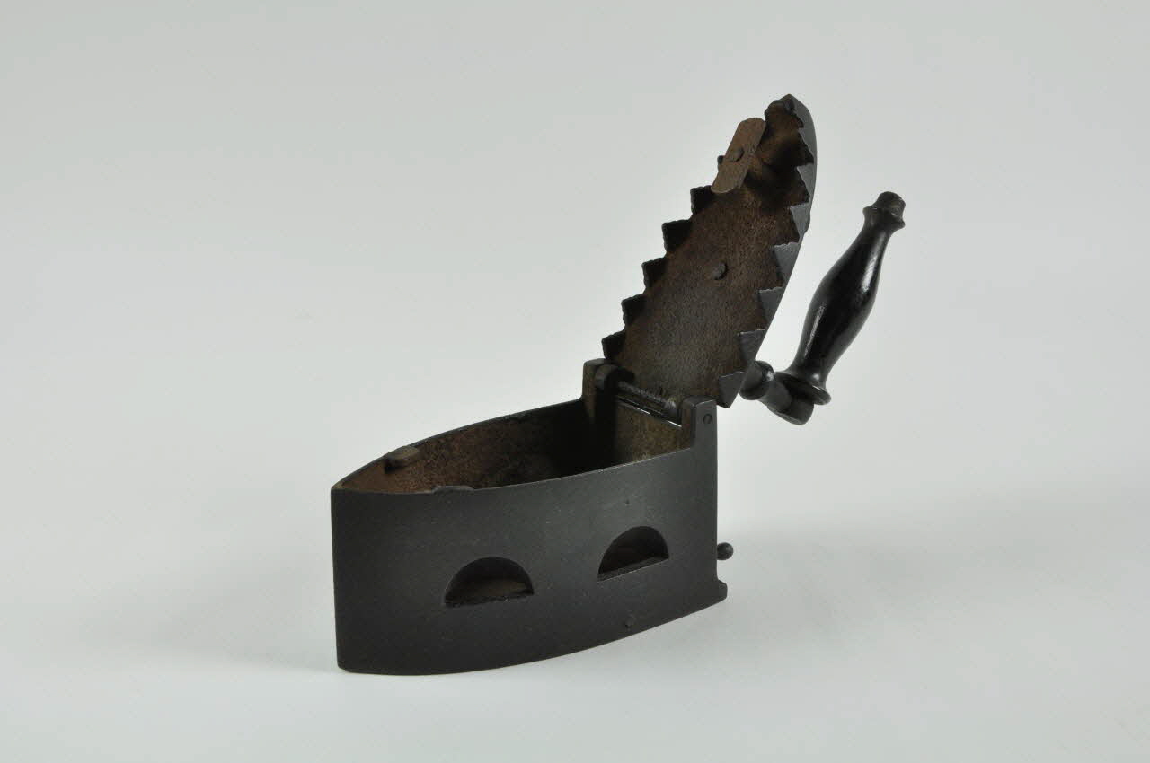 Fer à repasser en fonte avec une semelle lisse surmontée d'un corps ajouré en dents de scie à la partie supérieure, et ouverts avec des arcs de cercle ajourés à la partie inférieure. Au dessus, une poignée horizontale en bois sur un couvercle mobile fermé par un taquet mu par une petite poignée. A la partie arrière, ouverture rectangulaire fermée par une plaquette mobile tournant autour d'un axe avec un bouton de préhension.Décor