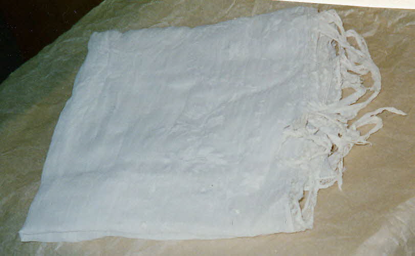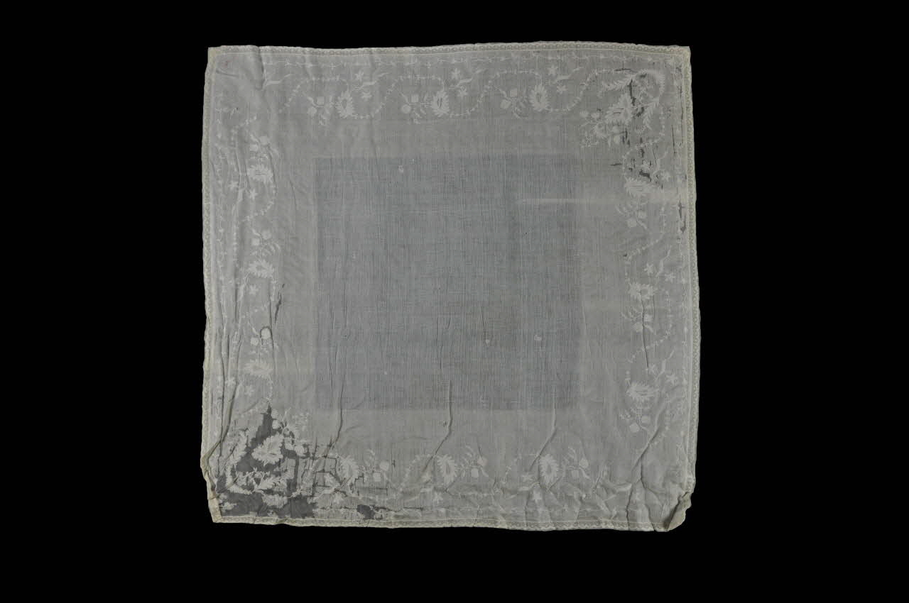 Mousseline blanche brodée. Elle est bordée d'une dentelle.