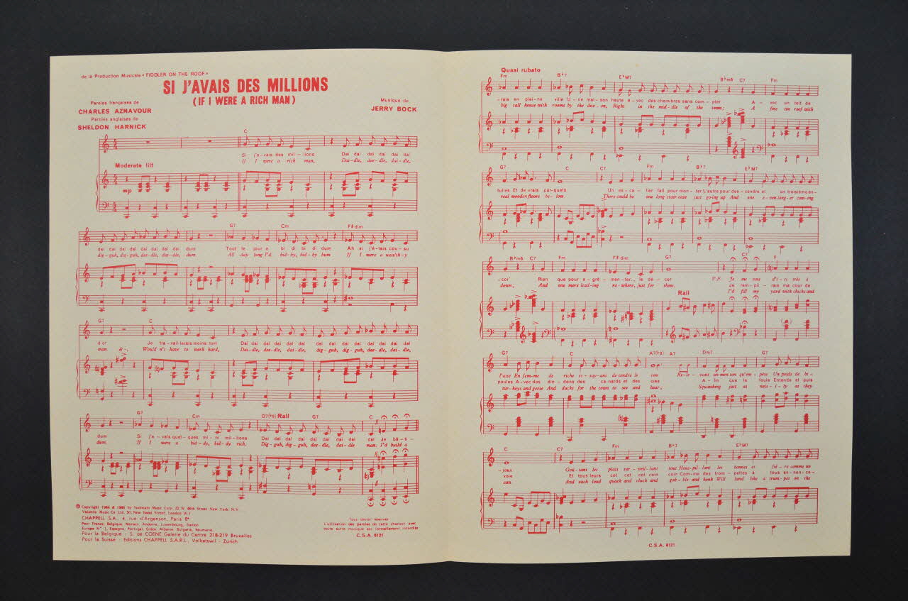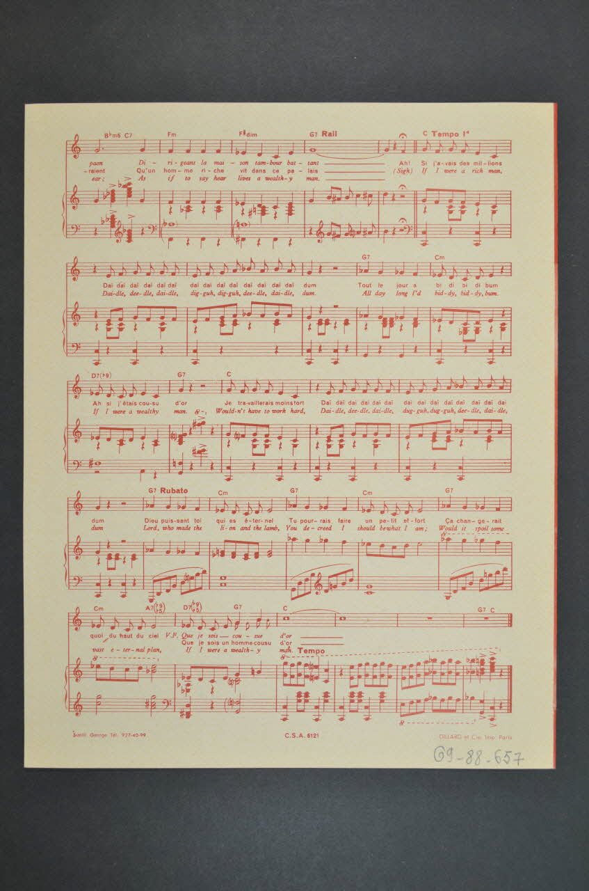 Sur la couverture, le portrait photographique de Dalida. Les inscriptions renseignent le titre de la chanson, le nom des auteurs, de l'artiste et de l'éditeur. A l'intérieur et au dos, partition et paroles de la chanson.Matériaux et techniques