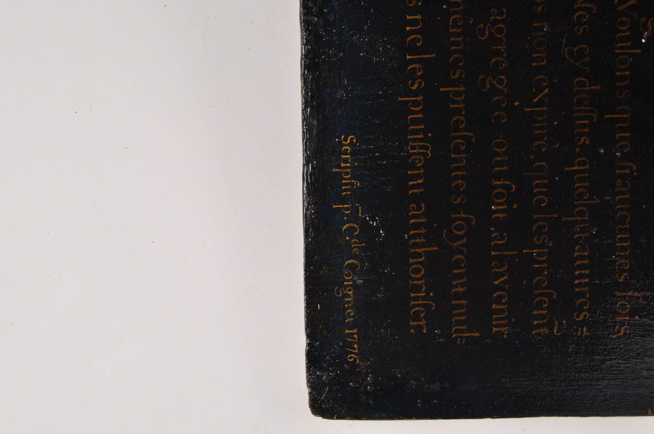 C.DE COIGNET 1776 (S.b.d.) ; INDULGENCES PERPETUELLES/POUR LES CONFRERES DE L'ADORATION DES/PENITENS BLANCS/ETABLIS EN LA VILLE DE ST ETIENNE DE FURENS/DIOCESE DE LYON (h.C.) (Peint sur la toile.)Étiquette manuscrite