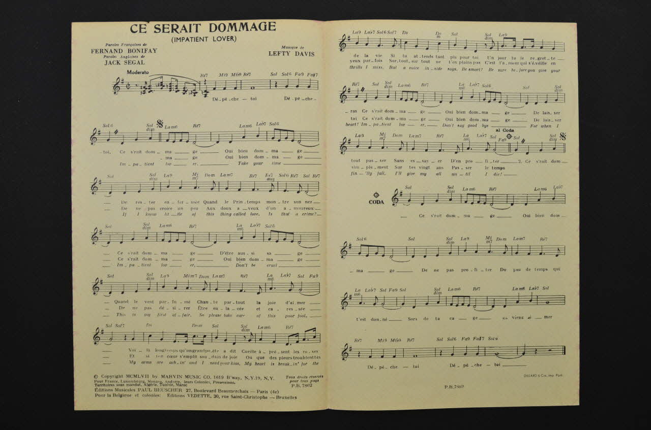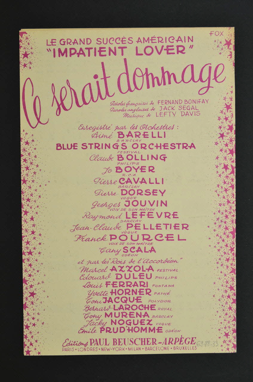 Sur la couverture et au dos, les inscriptions renseignent le titre de la chanson, le nom des auteurs, des artistes et de l'éditeur ; sur les bordures, motifs d'étoiles. A l'intérieur, partition et paroles de la chanson.Matériaux et techniques