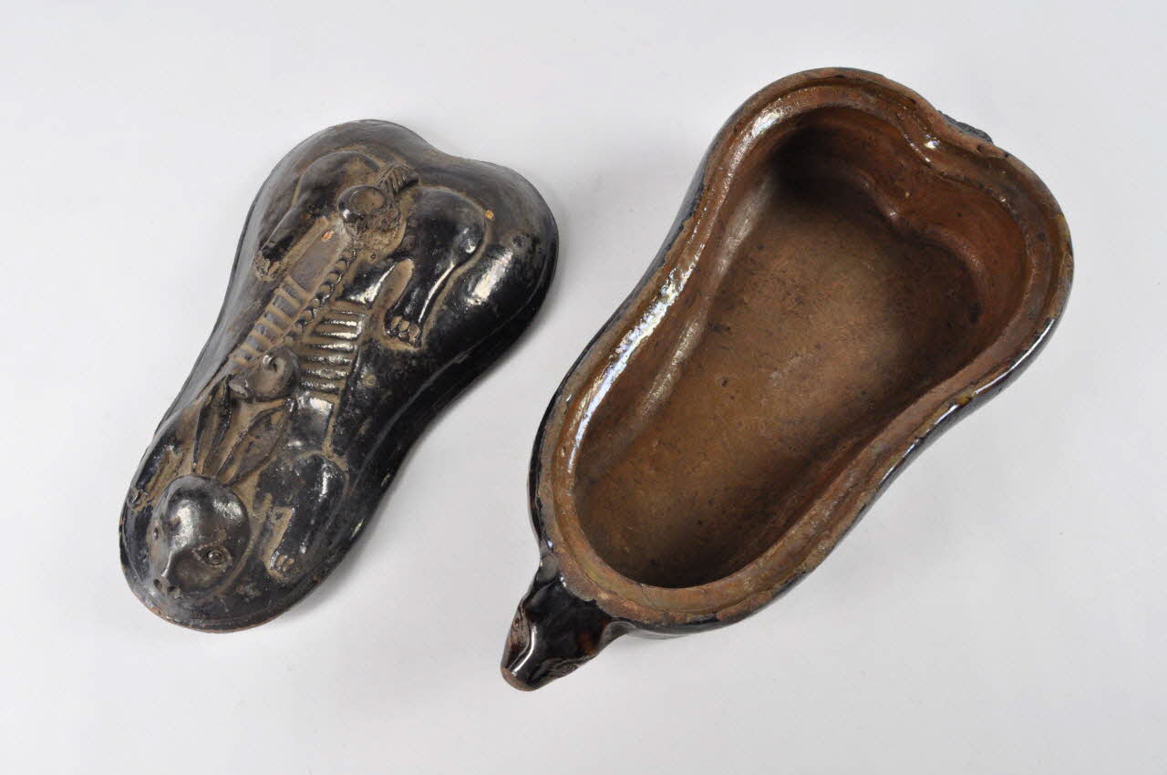 Terre partiellement vernissée, moulée, découpée et estampée / De forme elliptique et à bords moyens avec une tête de lapin formant la poignée latérale; décoré de fleurs de lys; Couvercle orné d'un lapin.Décor