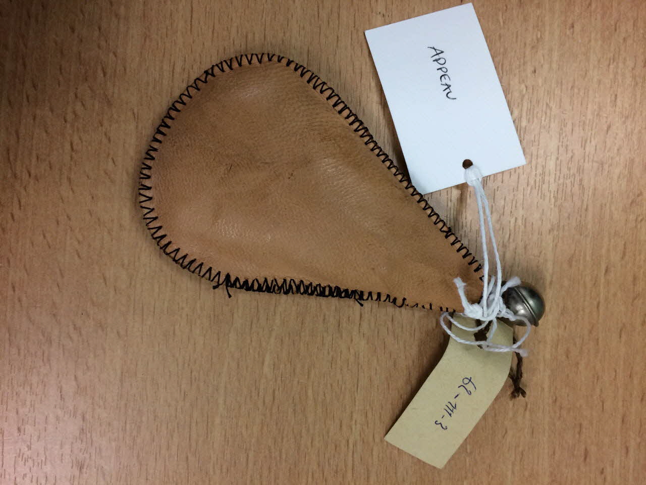 Appeau inséré dans une poche de cuir cousue avec du fil noir et bourrée comme de paille / Tube soudé à une sphère, sortant d'un réservoir en cuir.