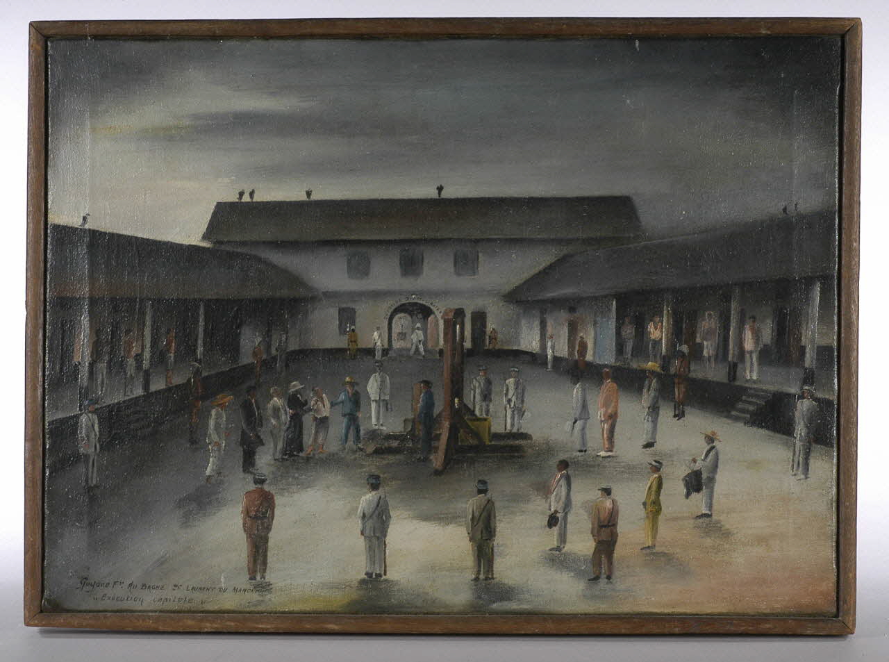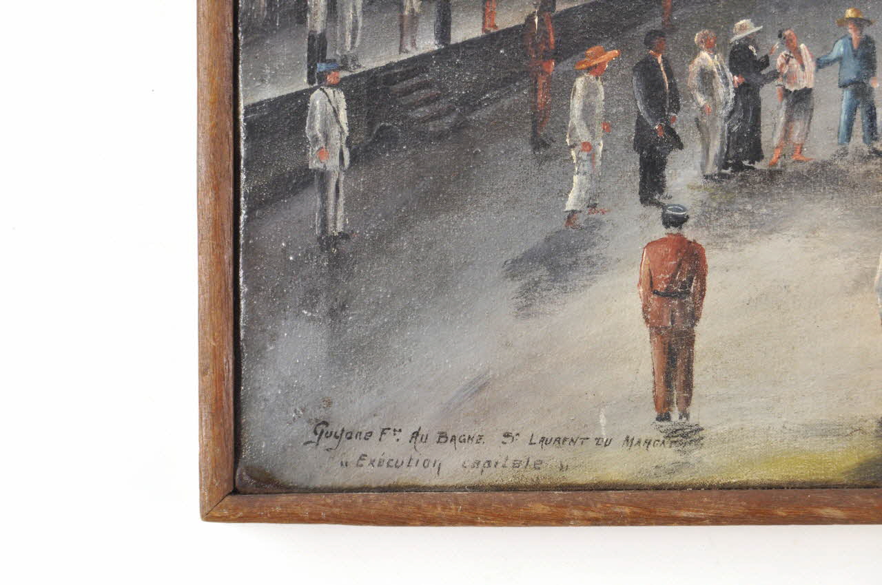 La guillotine est dressée au centre de la cour principale du bagne, entourée de nombreux bagnards et surveillants. Le condamné est conduit par un bagnard et le prêtre vers 'la veuve" devant laquelle attend un bagnard faisant office de bourreau. La scène est encadrée par des bâtiments situés à l'arrière plan. Des oiseaux sont perchés sur les faîtes des toits. La toile est montée sur un chassis fixe, non chanfreiné. Des baguettes de bois sont présentes à l'extérieur.Décor