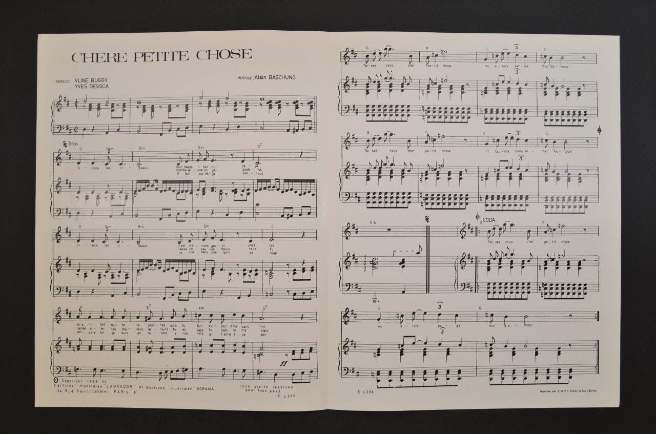 Les inscriptions renseignent le titre de la chanson, le nom des auteurs, de l'artiste et de l'éditeur. A l'intérieur, partitions et paroles de la chanson. Le dos est laissé vierge.Matériaux et techniques