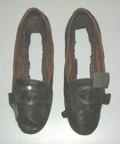 En cuir à bouts arrondis. Extérieurs teintés en noir. Semelles et intérieurs marron. Boucles métalliques sur le dessus du pied. Coutures en fil de coton beige. Petits talons carrés et cloués.Matériaux et techniques