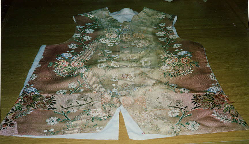 Soie brochée teinte, à partie postérieure en toile de coton. / Encolure ronde, sans col, ouverture partant de l'encolure, sans manches. Tissu broché, décoré de fleurs jaunes et vertes sur fond vieux-rose.Matériaux et techniques
