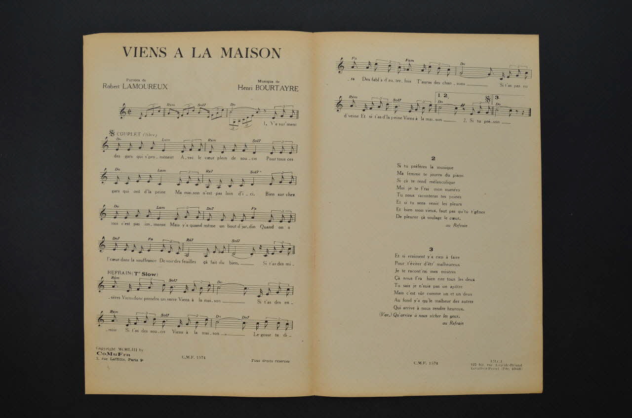 Sur la couverture, les portraits photographiques de Robert lamoureux, en haut à droite, et d'André Claveau, dans un encadrement rectangulaire, en bas à gauche. Les inscriptions renseignent le titre de la chanson, le nom des auteurs, de l'artiste et de l'éditeur.