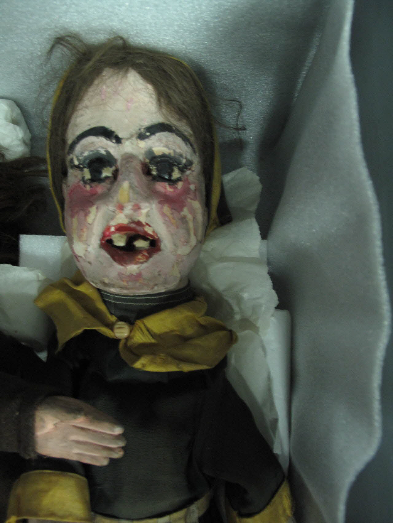 bois sculpté peint à l'huile, coton rayé rouge et blanc, matériau textile synthétique vert foncé, en coton carreaux jaunes et blancs, vrais cheveux, satin jaune, plastique / La tête et les mains sont en bois sculpté peint à l'huile. La gaine est en coton rayé rouge et blanc. La femme porte une robe en matériau textile synthétique vert foncé, un tablier en coton carreaux jaunes et blancs.
